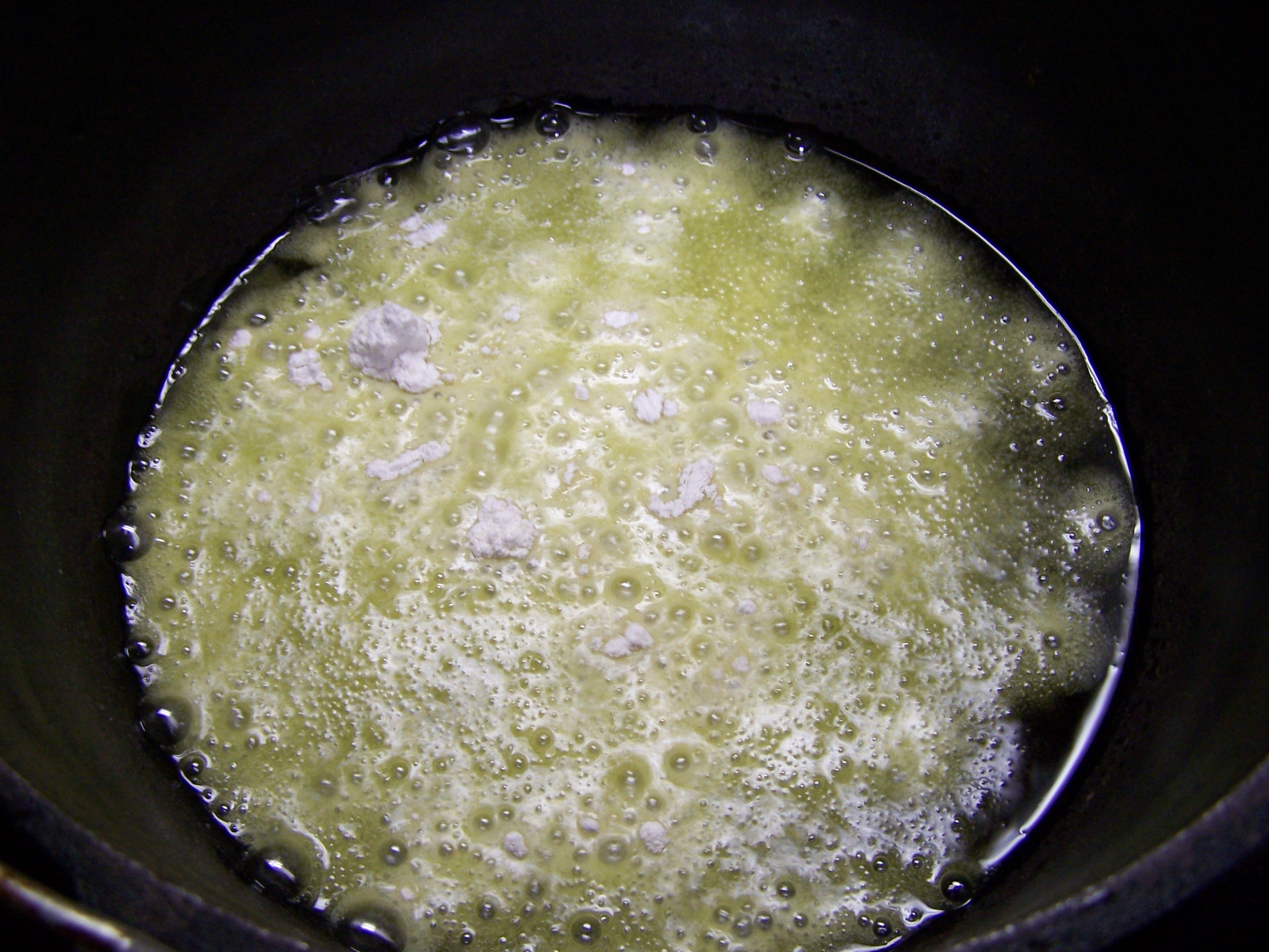 Heat the olive oil until it gets hot. Then add flour. Whisk.