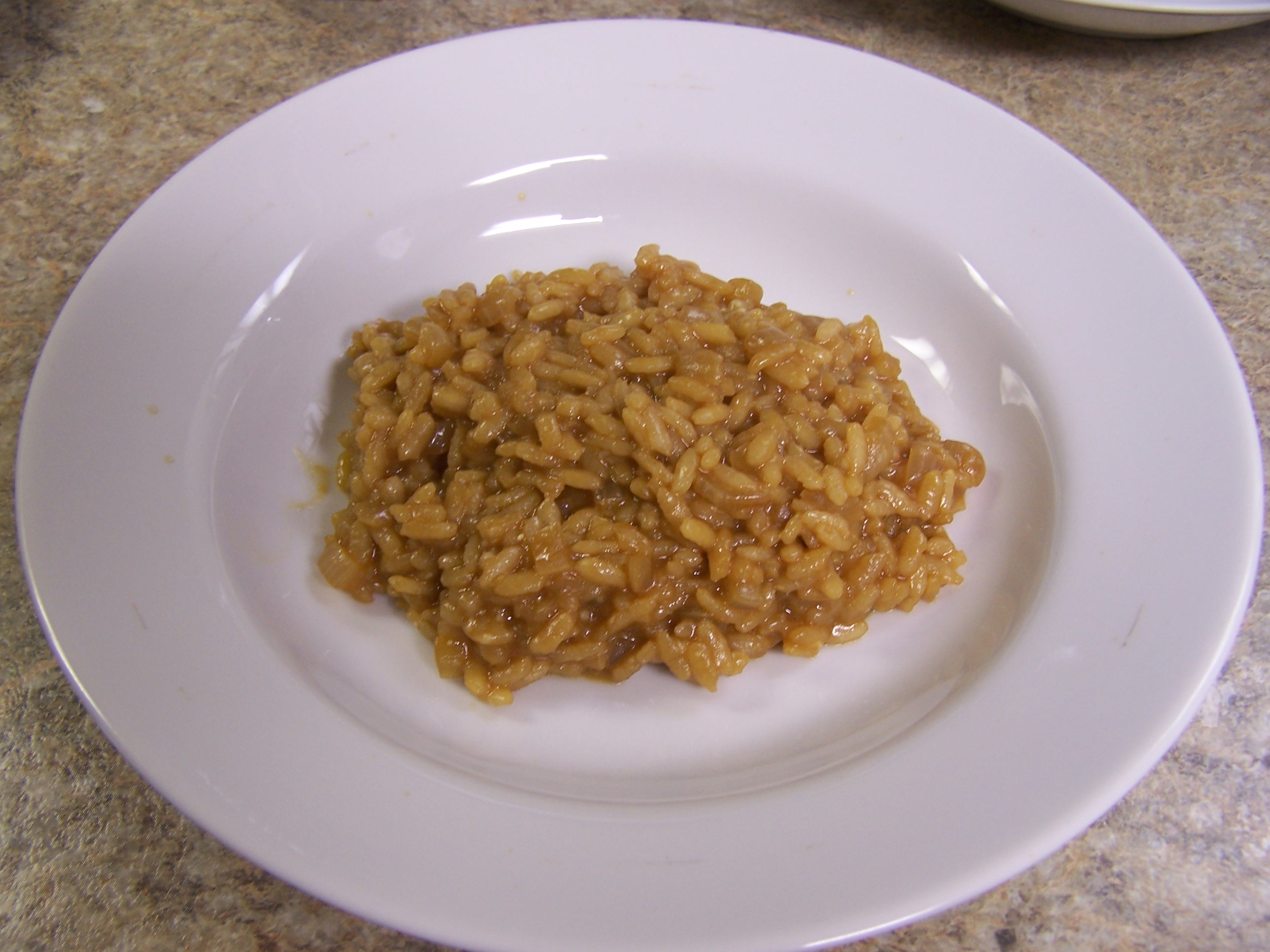 In a 2 quart saucepan with a lid, sauté the onions and rice in olive oil (8 minutes). Add wine and 1 cup of stock, bring to a slight boil and then simmer and place a lid on the saucepan. Keep an eye on it and when the liquid is almost absorbed add the last cup of stock. Keep stirring until cooked al dente. Add the butter and the Parmesan cheese and stir, then serve.