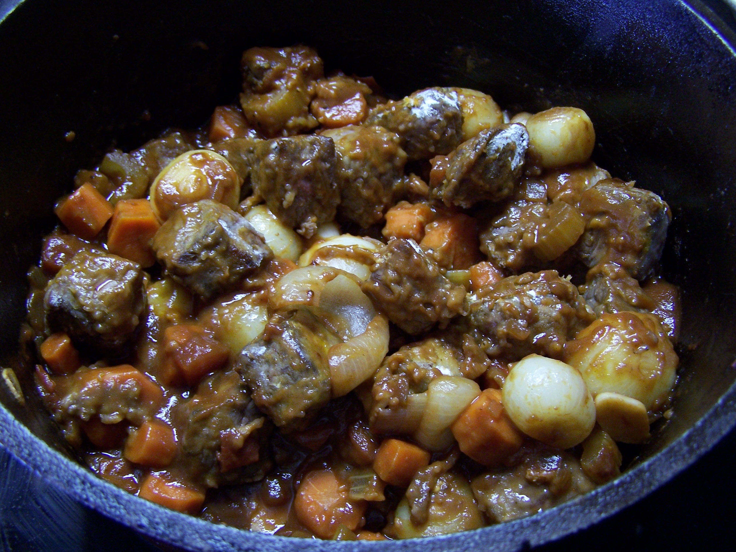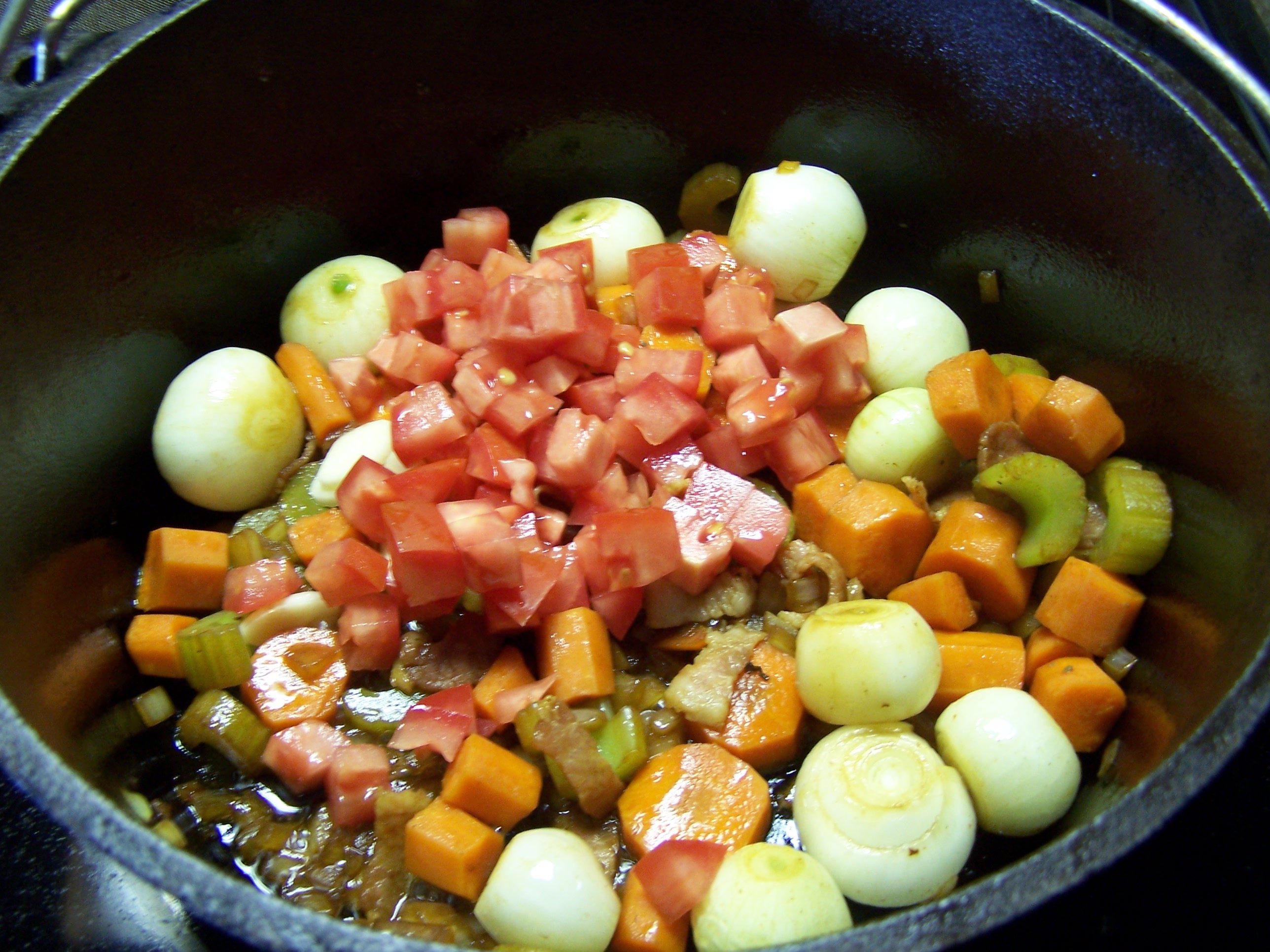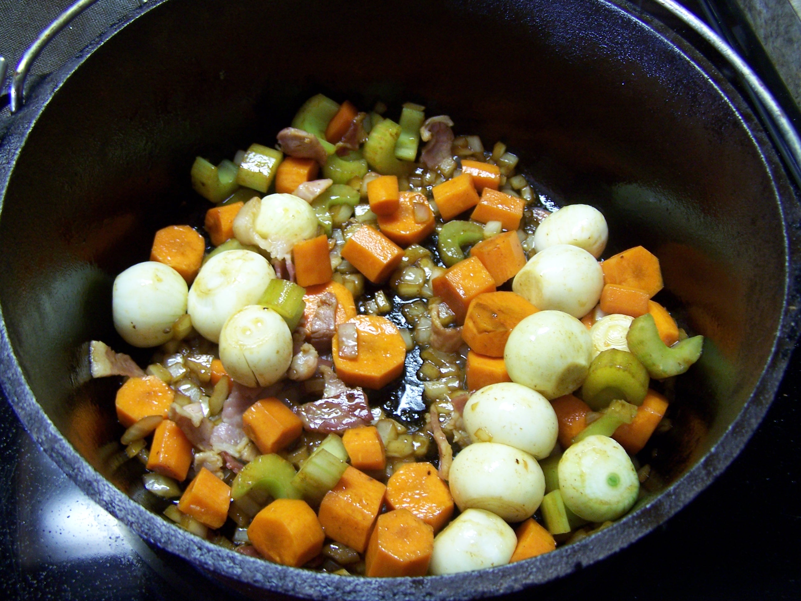 Place the mirepoix into the frying pan and sauté in the remaining juices and oil in the pan left by the beef and bacon, adjust oil and return the bacon and add the pearl onions and chopped tomatoes and garlic and sauté another 6 minutes.