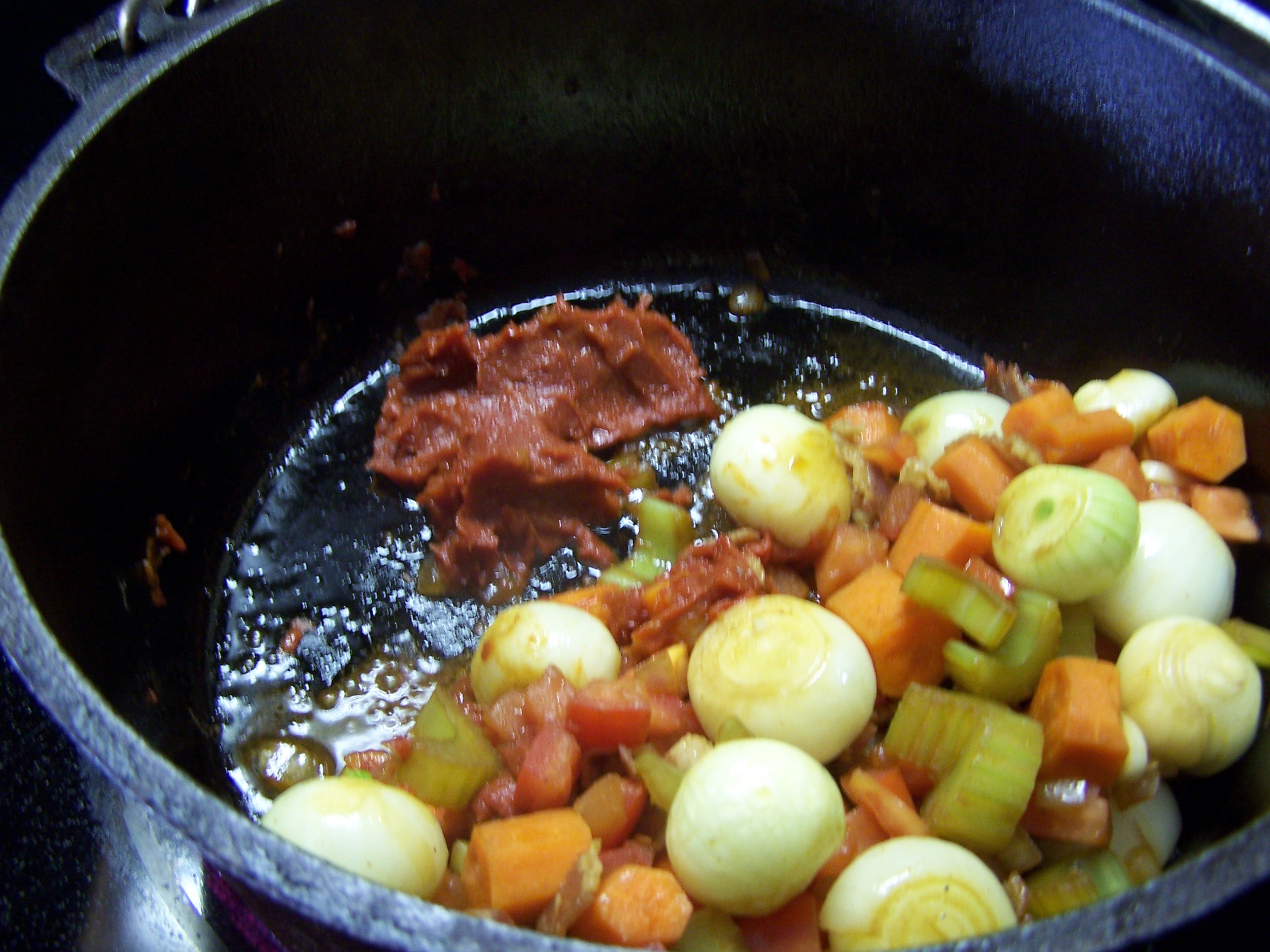 Then move mirepoix to one side and fry the tomato paste about 5 minutes.