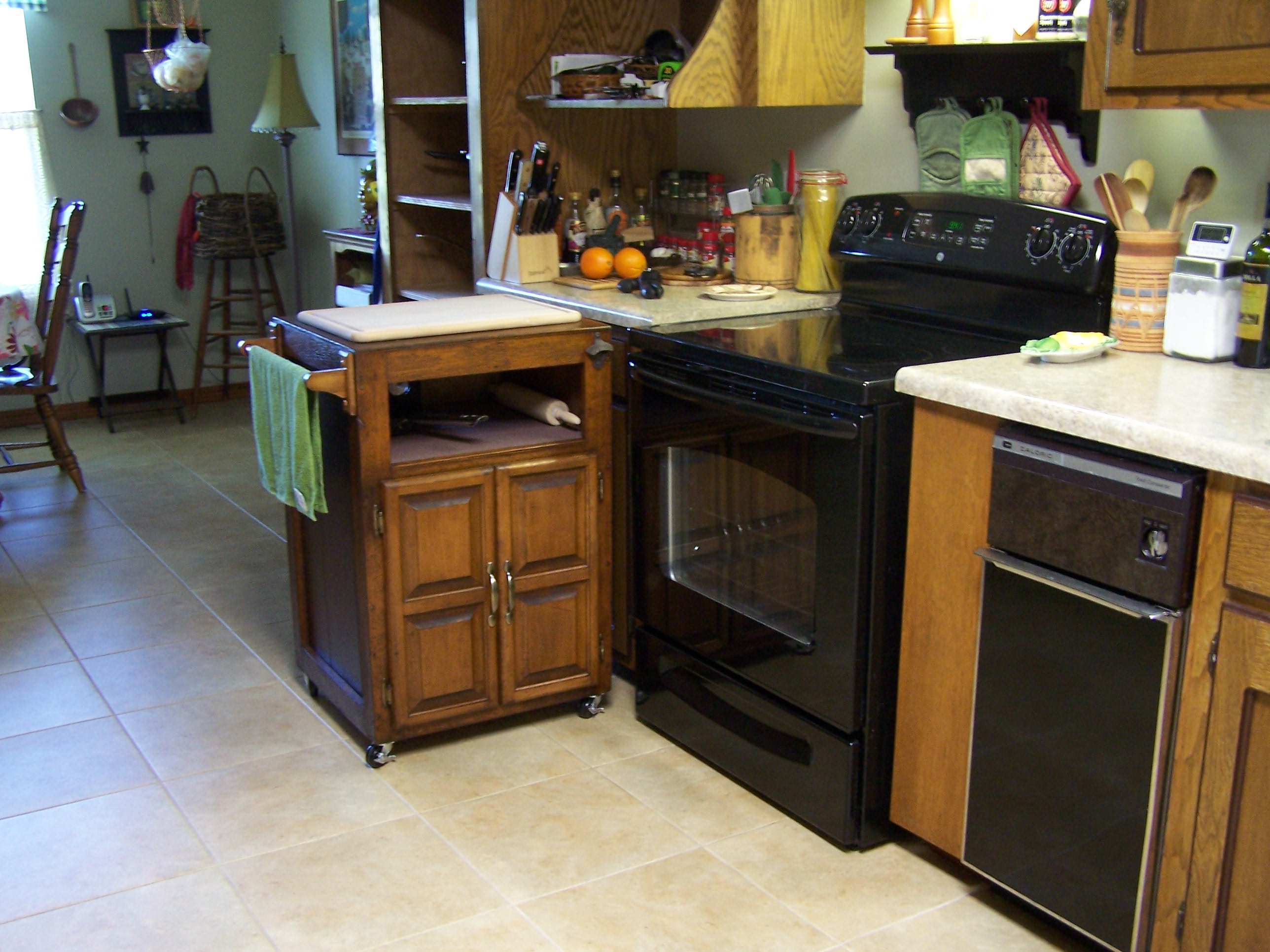 The Little Woman found an old cabinet in a thrift store. She hung doors on it and added new hinges and handles. Added a wooden towel rack on one side and hooks on the other side and an antique bottle opener for my ale. She laid soft covering on the shelves and added rolling 360 degree casters on the bottom. Then she refinished it. Now I can chop food next to the stove or sink, roll the thing anywhere and I have plenty of room to make pasta and bread, which I do every weekend.