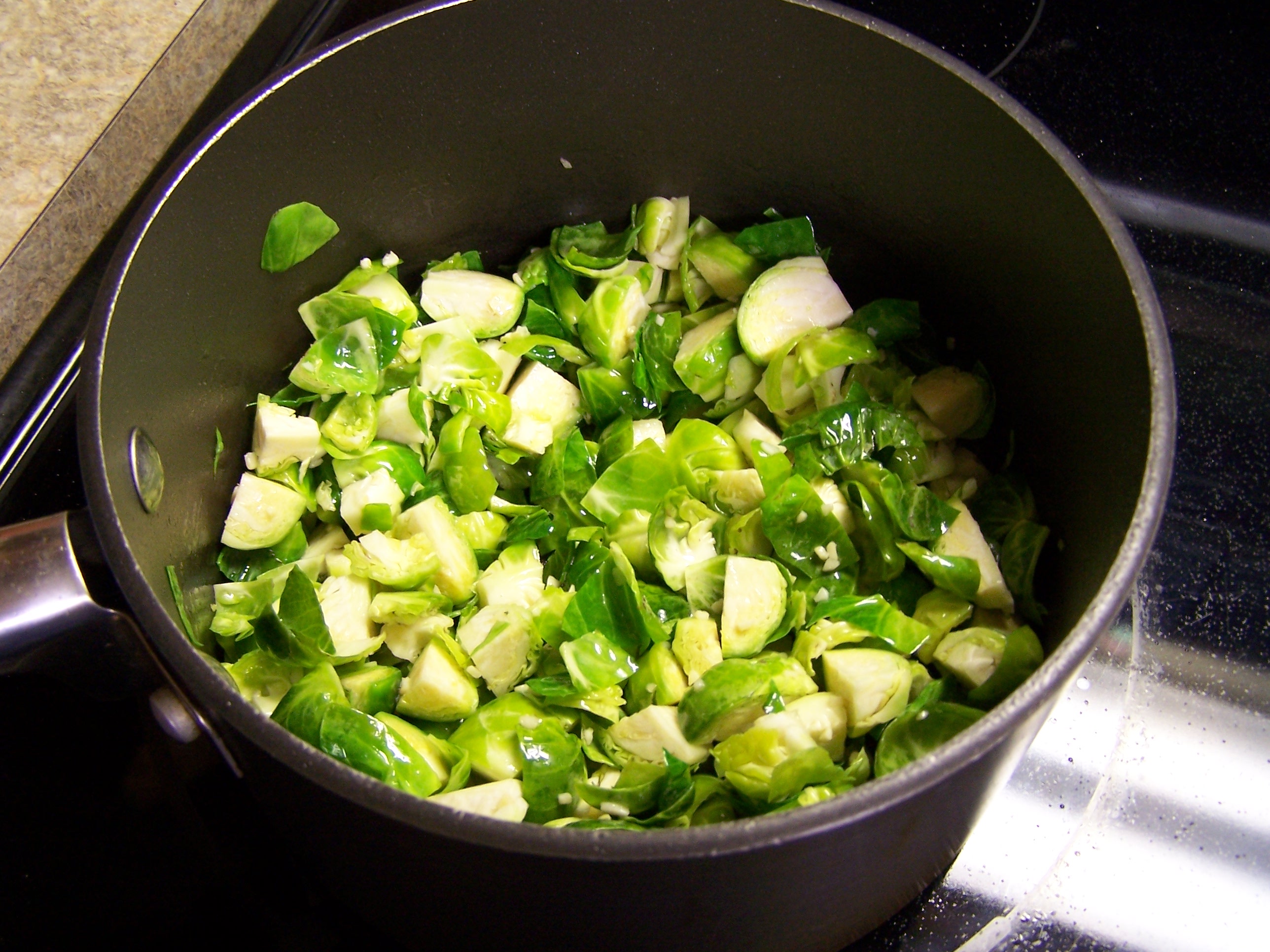 In a two quart pan on high heat get olive oil hot. You will want to fry the Brussels sprouts for a couple of minutes. When the oil is hot add the sprouts and turn several times coating the sprouts in oil.