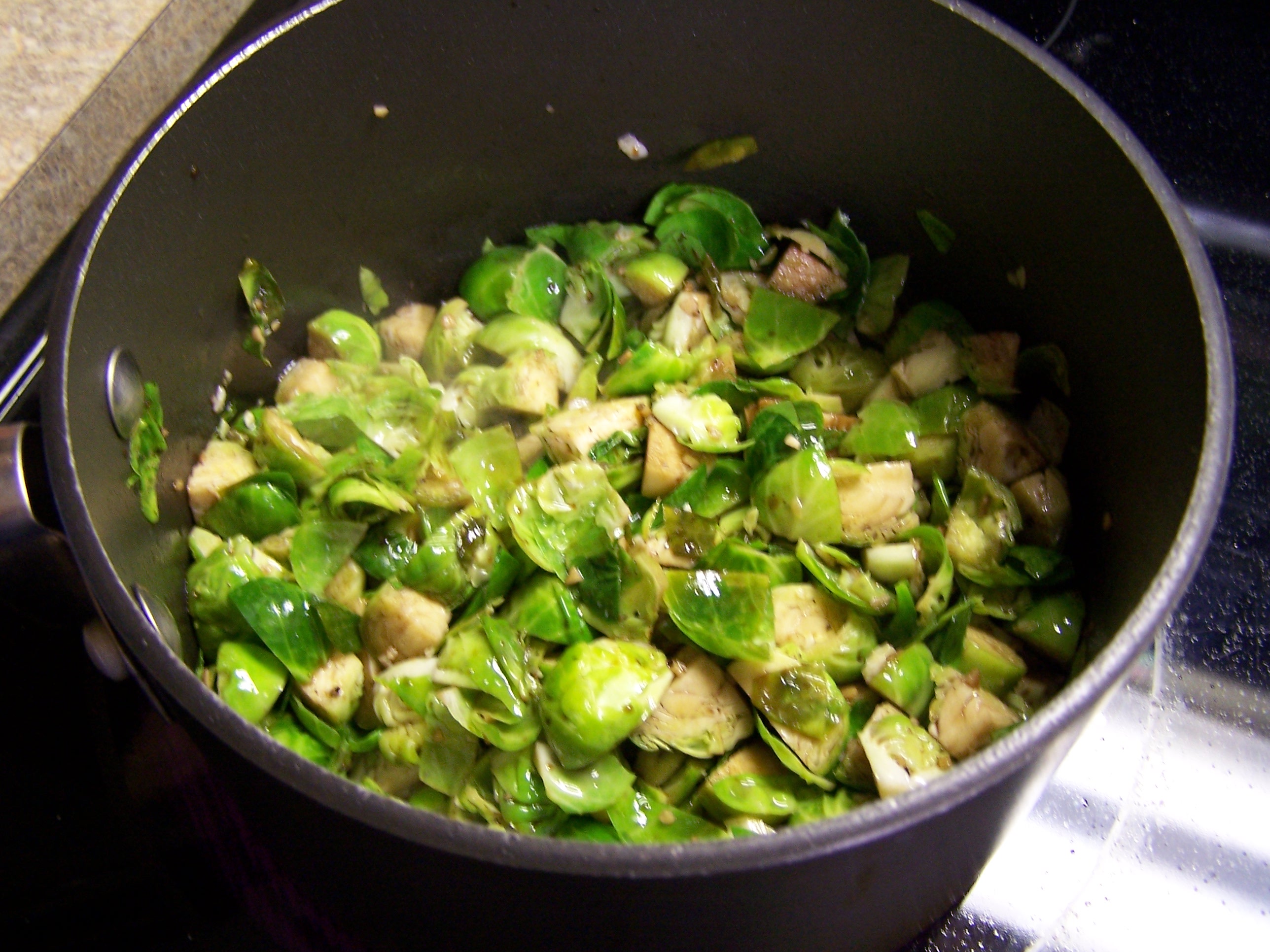 Add the garlic and stir. Keep turning another minute or two, add the Balsamic and Worcestershire, salt and pepper, turn off heat and cover. Let the sprouts now steam in the pot for about 8 minutes or so until al dente, serve as a side.