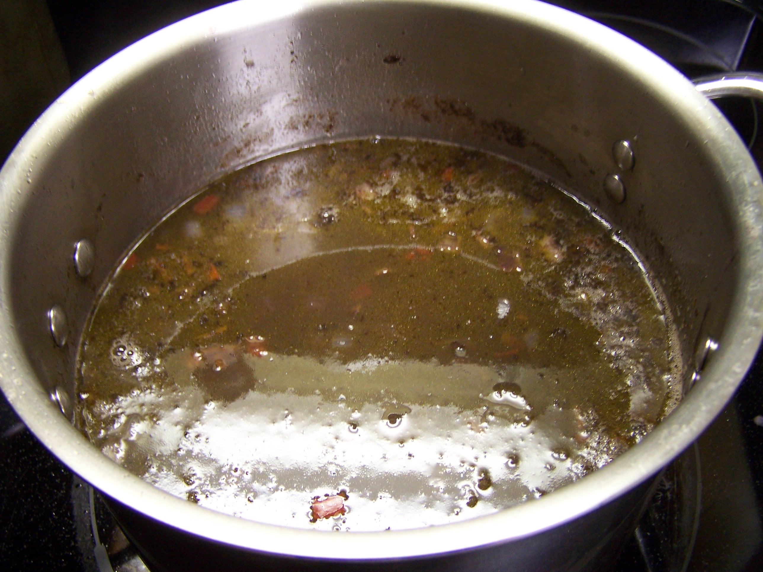 Add the white wine and the beans and then the chicken stock. Bring to a boil then reduce to a low temp and cook for roughly two hours. Then add the meat and cook another 30 minutes.