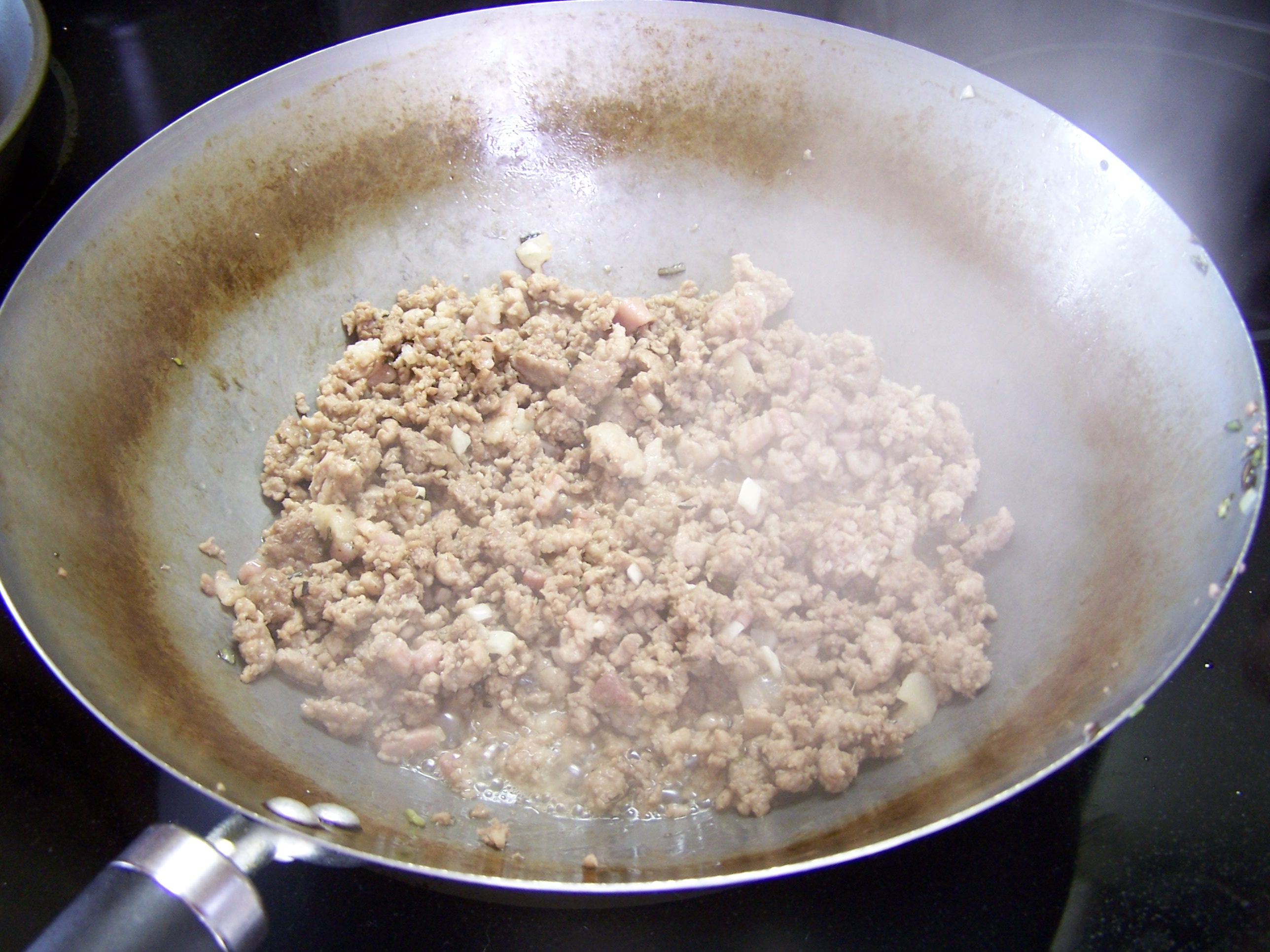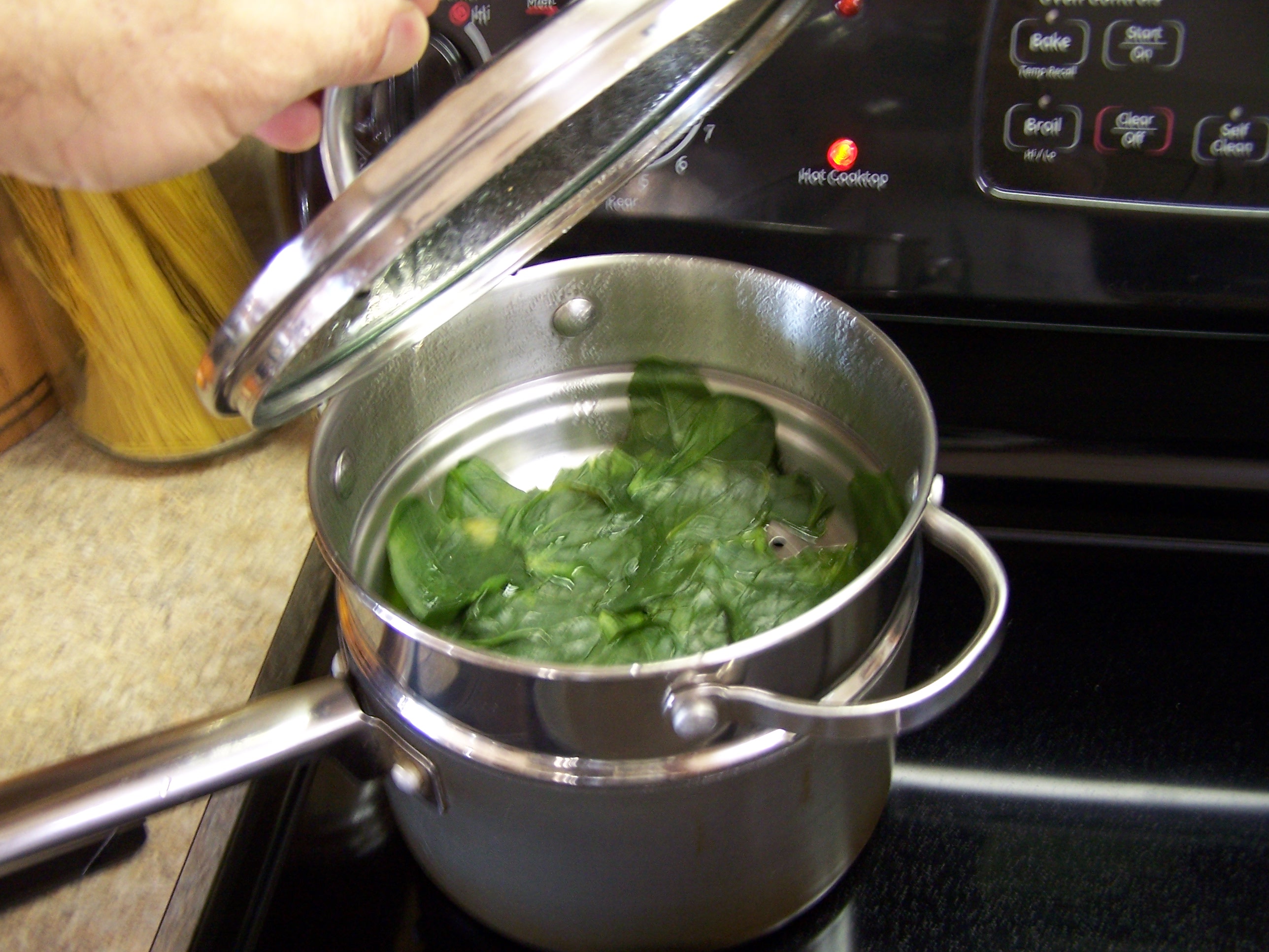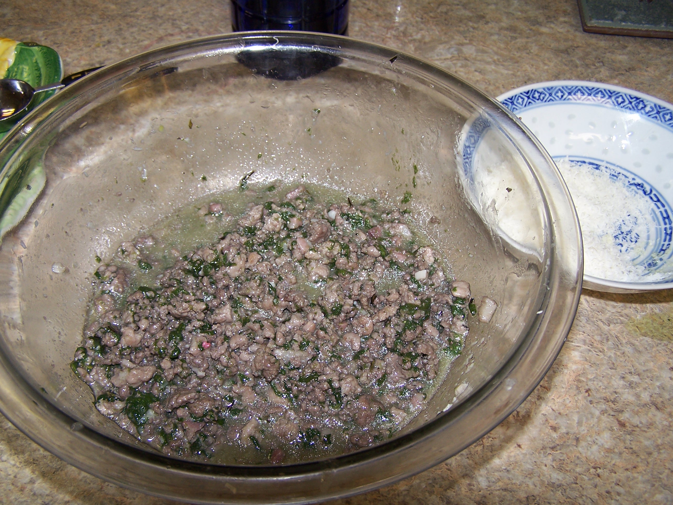 I browned the meat in olive oil in a hot wok b/c I wanted to get the meat cooked and browned and the moisture burned off quickly. I added rosemary and garlic. I moved the meat into a large bowl. I added 1 egg beaten and a cup of besciamella. I wanted the spinach like a pesto so I steamed it a long time, but you might want it more whole so you might want to just add frozen spinach. Ladle in the besciamella to bind the meat and combine.