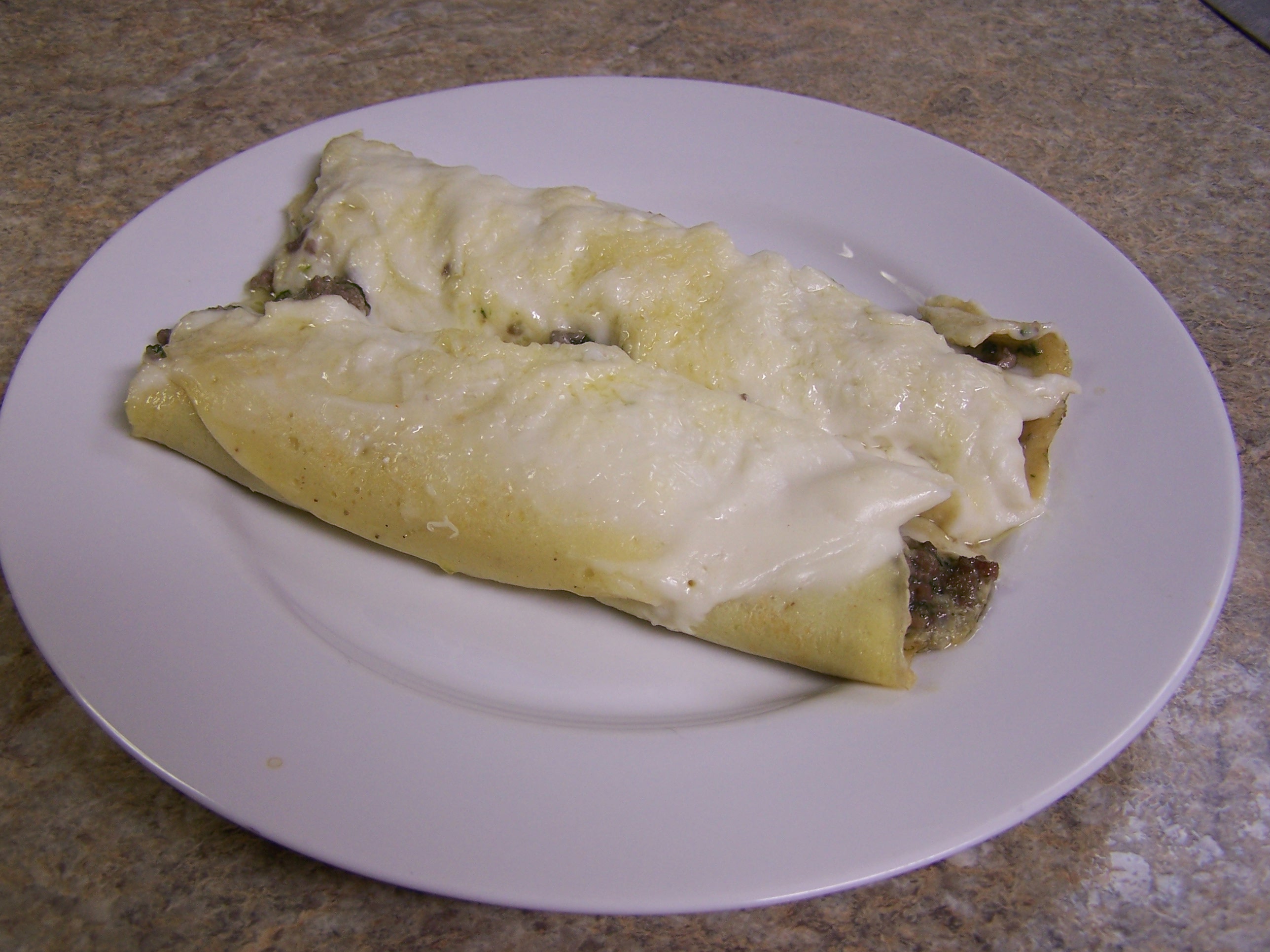 Typically, these dishes are made with pasta shells but I made this one using a crespelle (crêpe). It is pronounced [krehs-PEHL-leh]. This dish doesn’t look like much b/c it is covered in a besciamella sauce (Béchamel sauce), but I assure you, it is one of the most tasty dishes you will ever eat. And, it has a great cheese aroma.