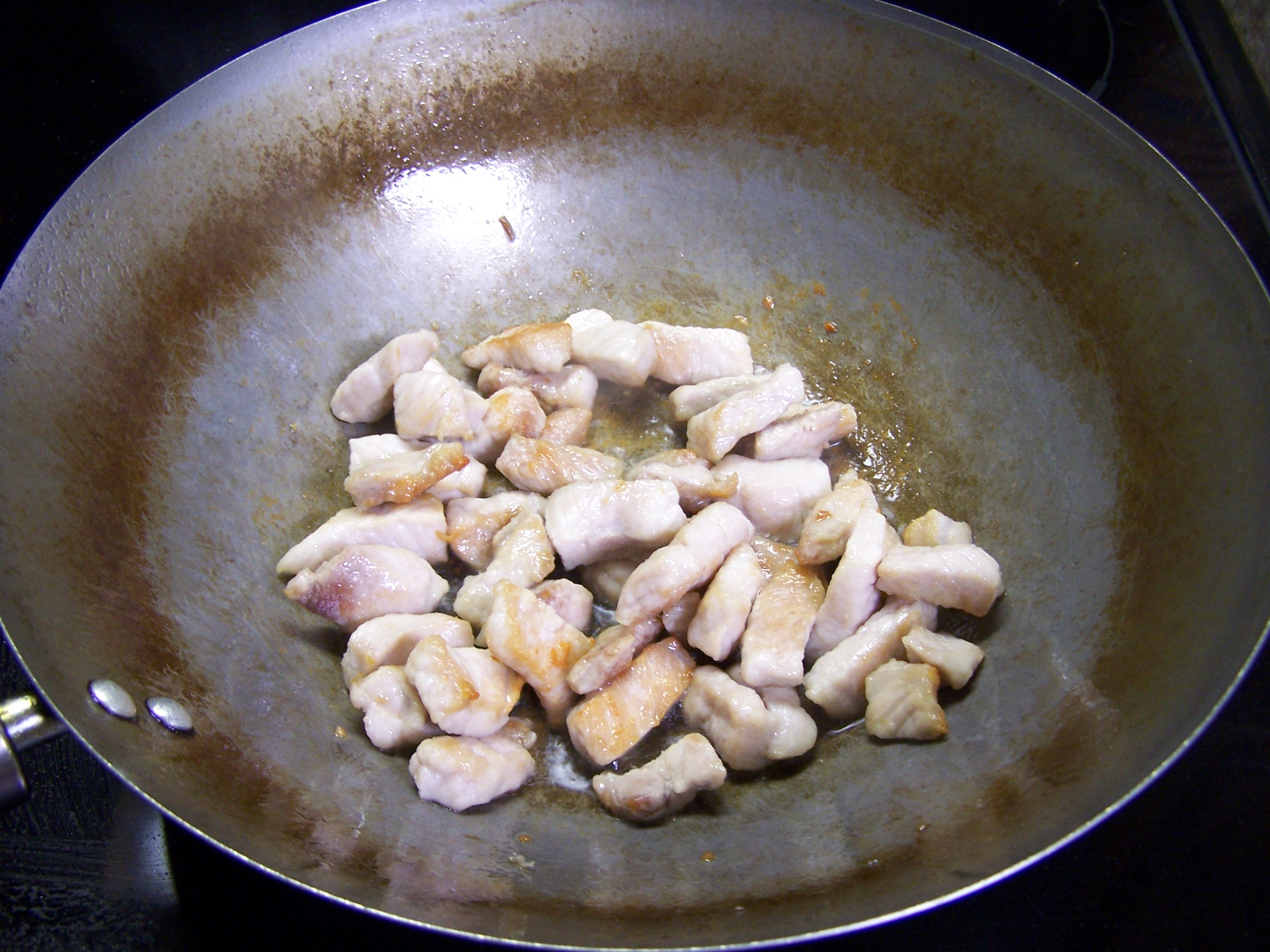 Canola oil (I use whatever I need). To get the wok started first get the wok hot then add the oil. For this dish I start with 1.5 TBSPs. This is where you develop a feel for the food. If you do it this way the meat will not stick.