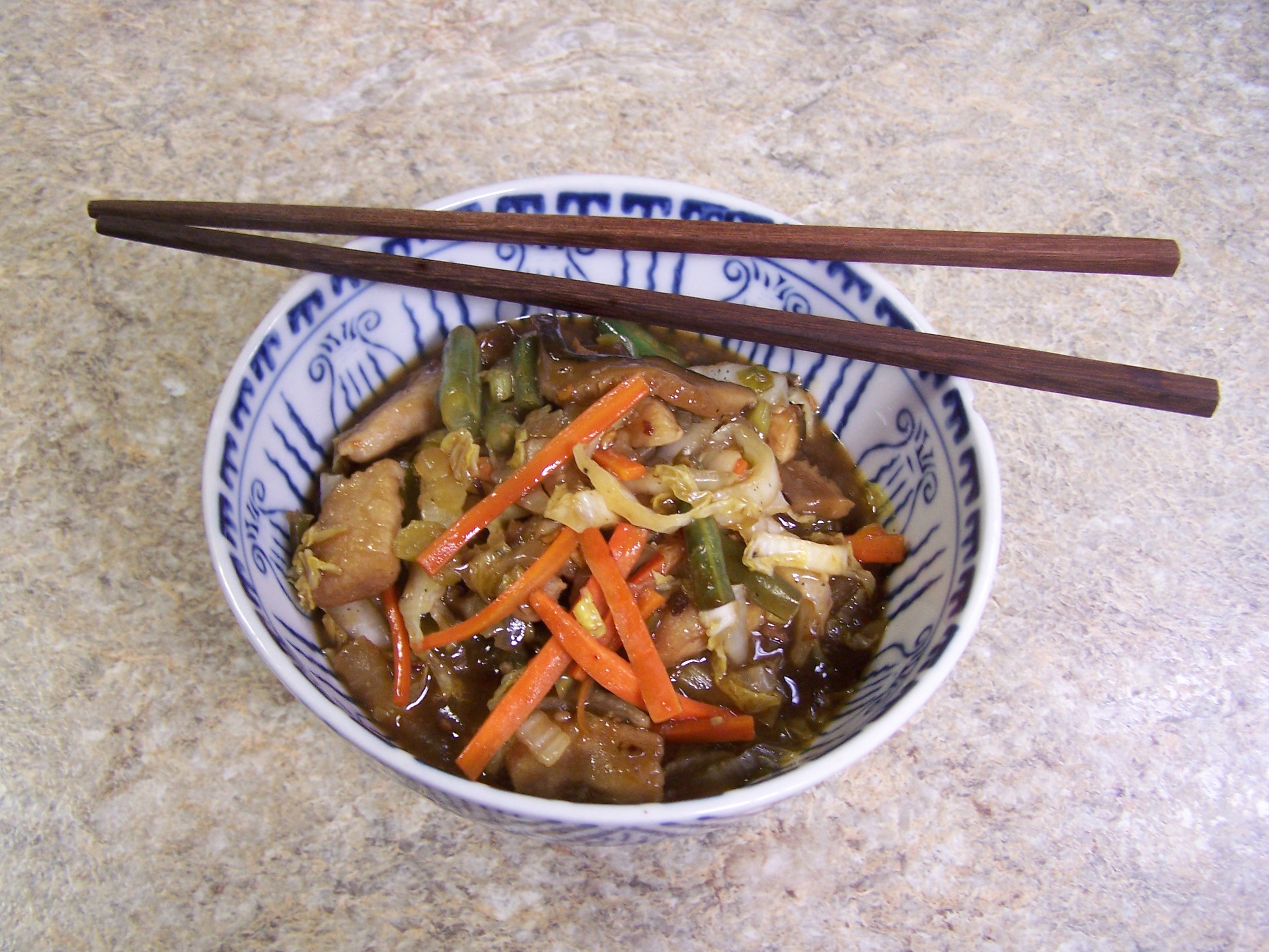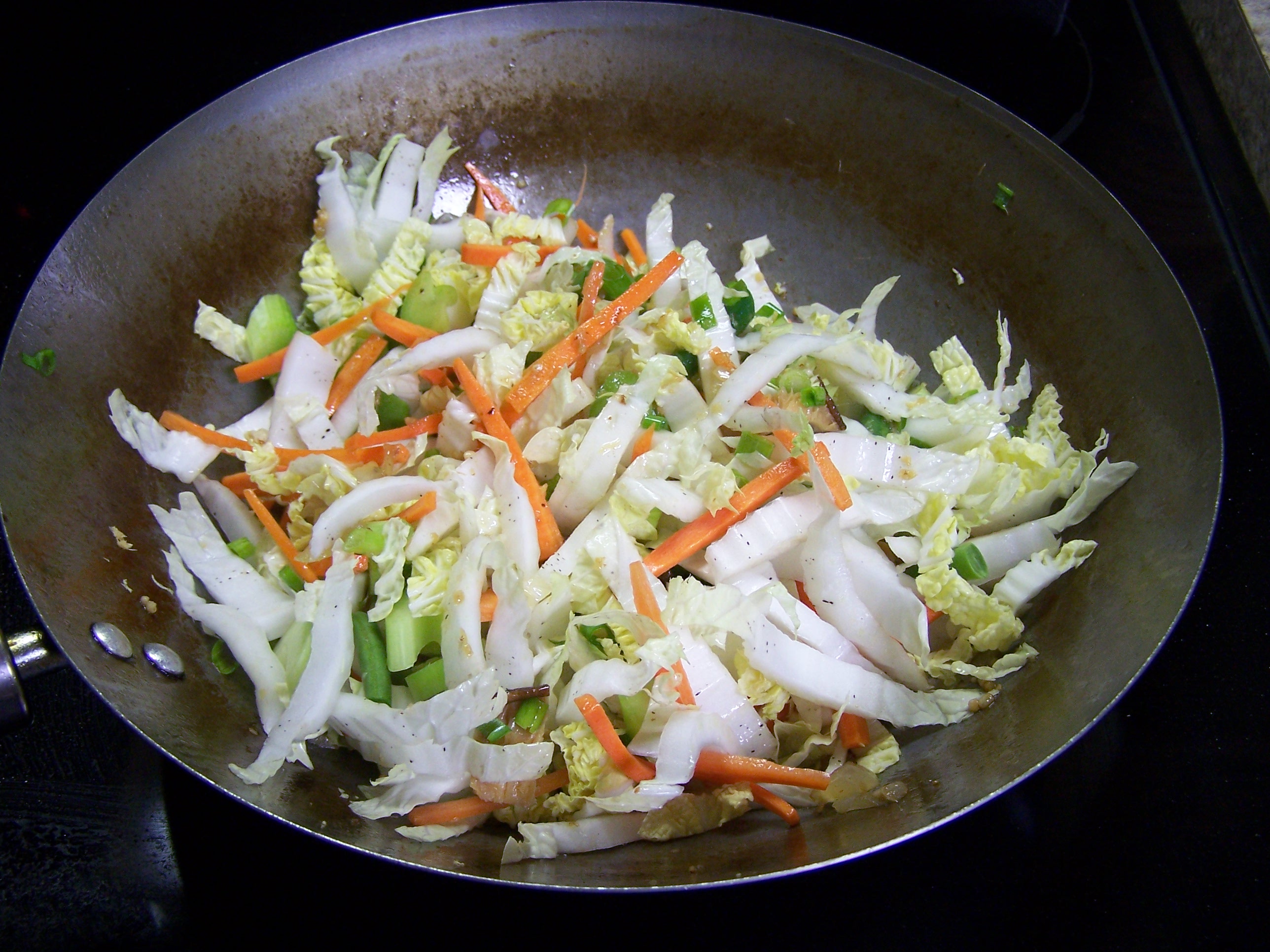 The basic veggies are Napa cabbage (Chinese cabbage), celery, carrot sticks, green beans, shiitake mushrooms (I use dried and re-hydrate), scallions and also daikon radish sticks when available, bamboo shoots or whatever you like.