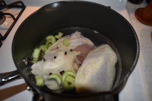 This is a classic chicken stock. I use this recipe in all my dishes needing a good chicken stock. In fact this also works well for veal stock and turkey stock substituting the meats. Place all in a soup pot and bring to a boil. Simmer 10-15 minutes or until you think the chicken has just cooked. Remove chicken and cool. Strain the chicken stock and discard the vegies. Save the stock in a two cup measuring cup so you can pour it later a bit at a time into the sauce. Once the chicken has cooled, deskin, debone and shred the chicken meat and set a side.