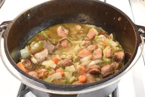 Cassoeula is a traditional dish in the Lombardia region, which lies in northern Italy. It is a hearty stew of cabbage and three or four cuts of pork such as ribs, sausage, bacon and pork butt (shoulder), sometimes snouts, lips and feet. Typically around slaughter there will be pieces of meats used for stewing – very little goes to waste.