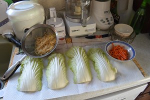 Dress 2 bowls with cabbage, red onion, carrots, cilantro and bean sprouts.