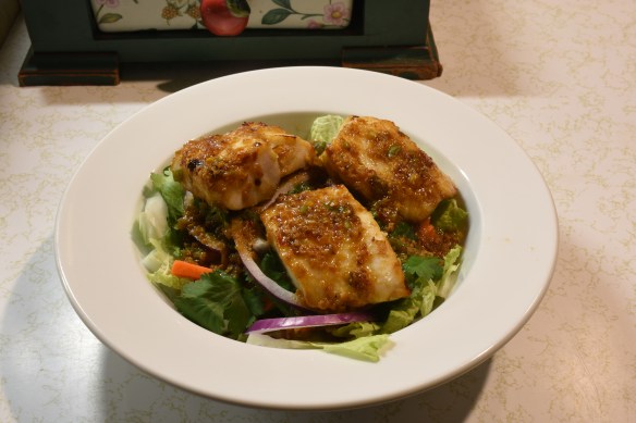 This is another adaptation of several Thai dishes. This uses a Thai honey sauce on white fish rather than salmon. Salmon works just as well.