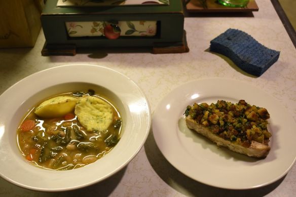 Gremolata: Cut off the ends of the bread and cut the bread ½ inch lengthways and the ½ inch widthways and then chop to make them into large bread crumbs. Place in a bowl and add 2 TBSP olive oil and toss. In a skillet toast the bread tossing until golden brown and remove (about 5 minutes). Place in a bowl. Add the rest of the ingredients and mix.