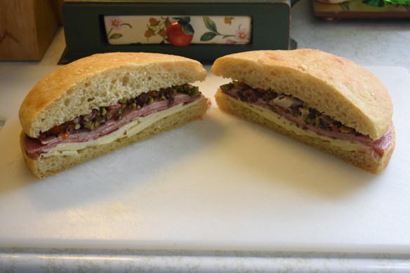 Cut the bread lengthways in half, spread some of the oil from the olive salad on the bottom piece of bread, add the cheese, layer the meat and then the olive salad. Cook in the oven until the cheese begins to melt. Quarter it. “You’ve just created pure heaven.”