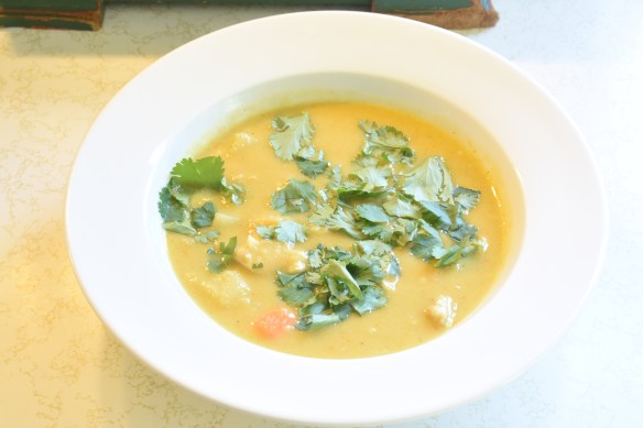 Add the chicken, add the bay leaf, carrot pieces and the last potato cut into small squares. Add ½ tsp. of curry blend. The idea is to get a thick soup. Cook another 15 minutes.