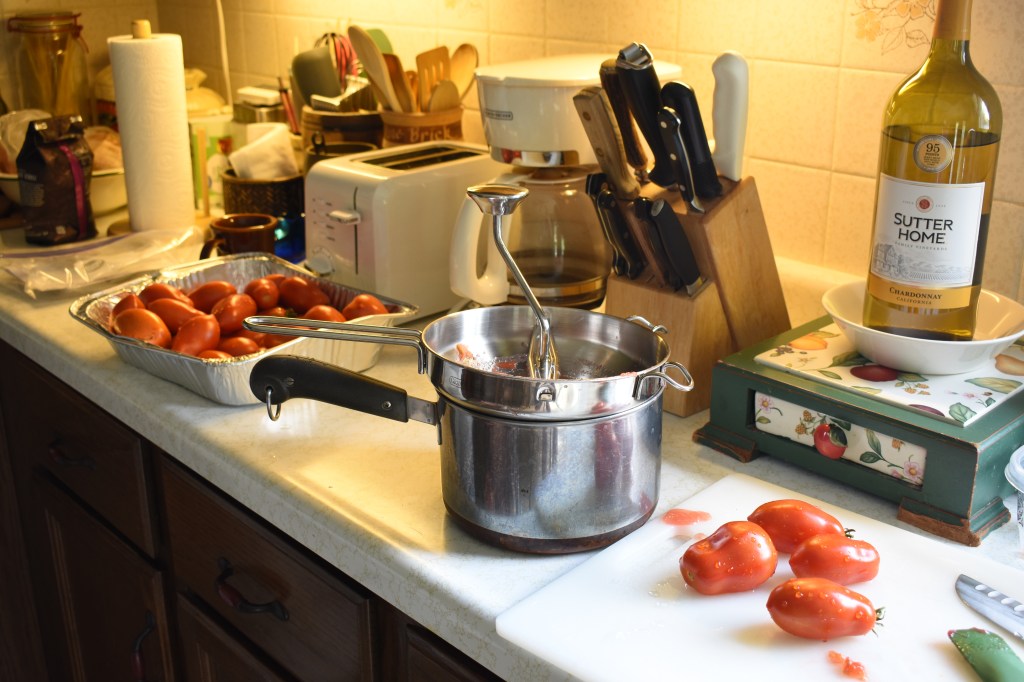 Run the tomatoes through a tomato miller. This mill machine separates the seeds and skin from the meat. This yielded exactly 56 oz. of meat.