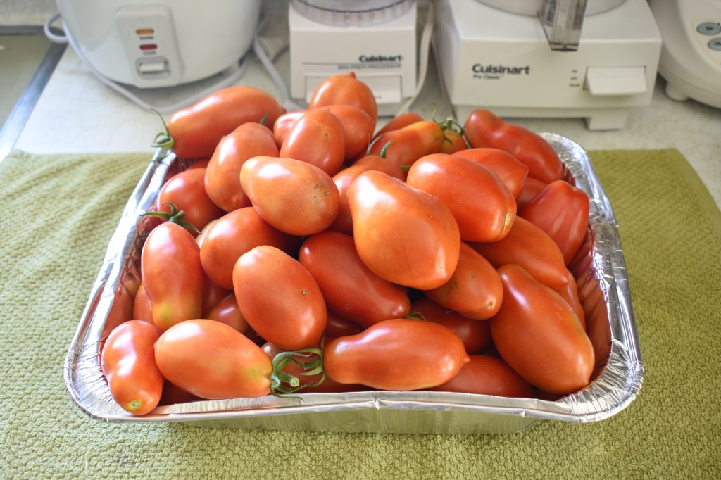 One big batch of fresh San Marzano tomatoes or a combination of San Marzano, Roma, Cherry and another tomato.