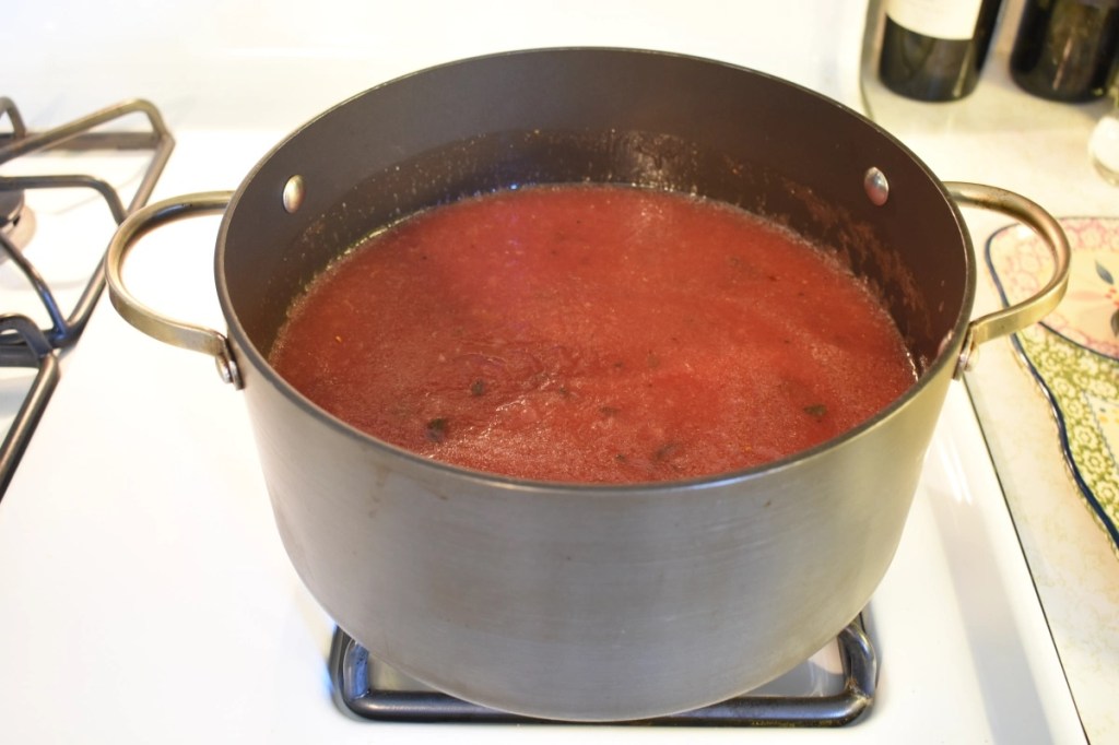 Add the herbs to the pot and cook all on a low temp until the water evaporates and the sauce gets thick. Maybe 3 hours or more on low. Refrigerate overnight.