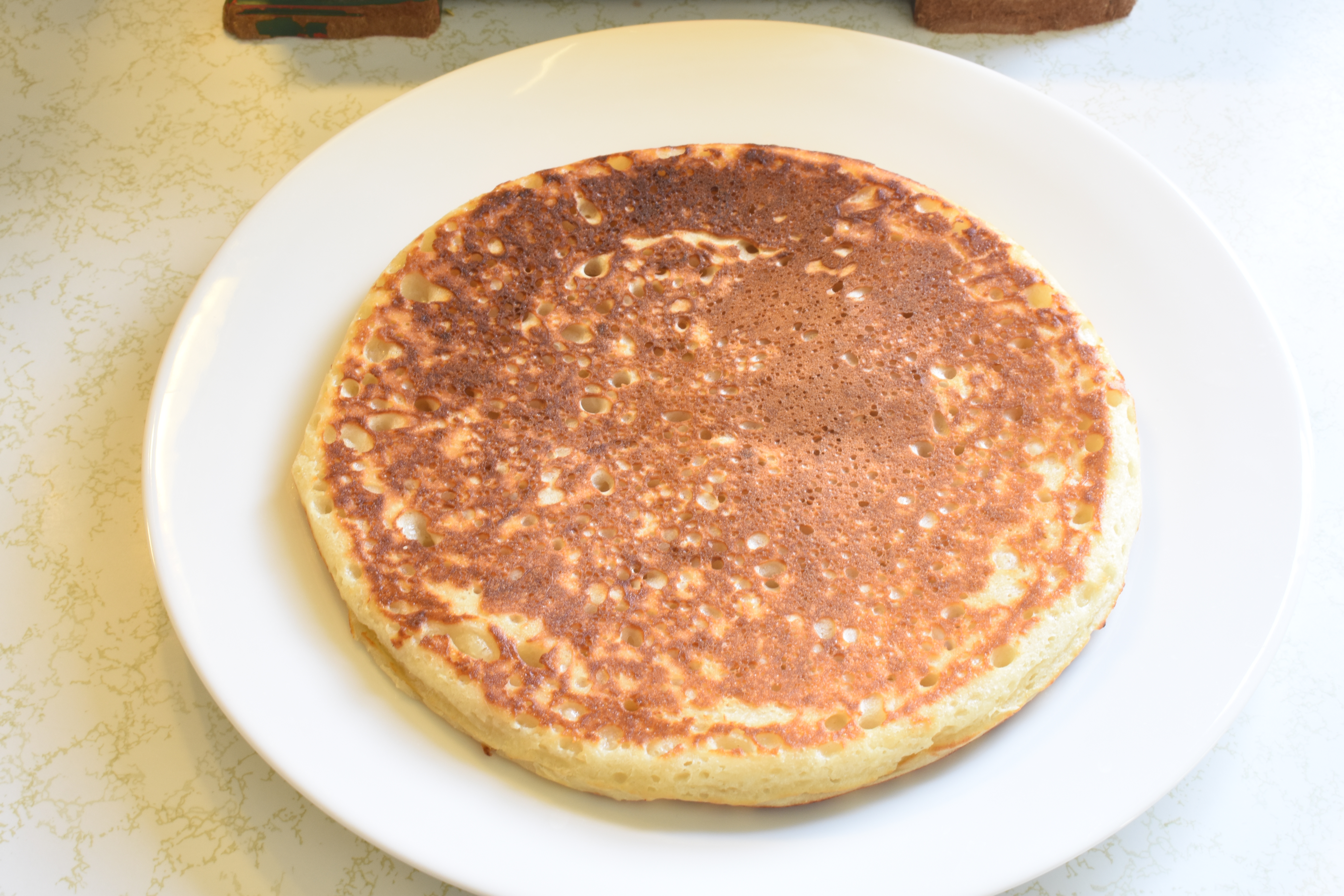 In a 8 inch pan, melt the butter and get pan hot on medium heat. Pour in the batter and brown on bottom (~3 to 4 minutes), turn over, brown for another 3 to 4 minutes. Remove like a large pancake and cut into 4 pieces. Serve with breakfast. I serve this with banger sausage and an egg over easy. I don’t have crumpet forms so I use an 8″ pan.