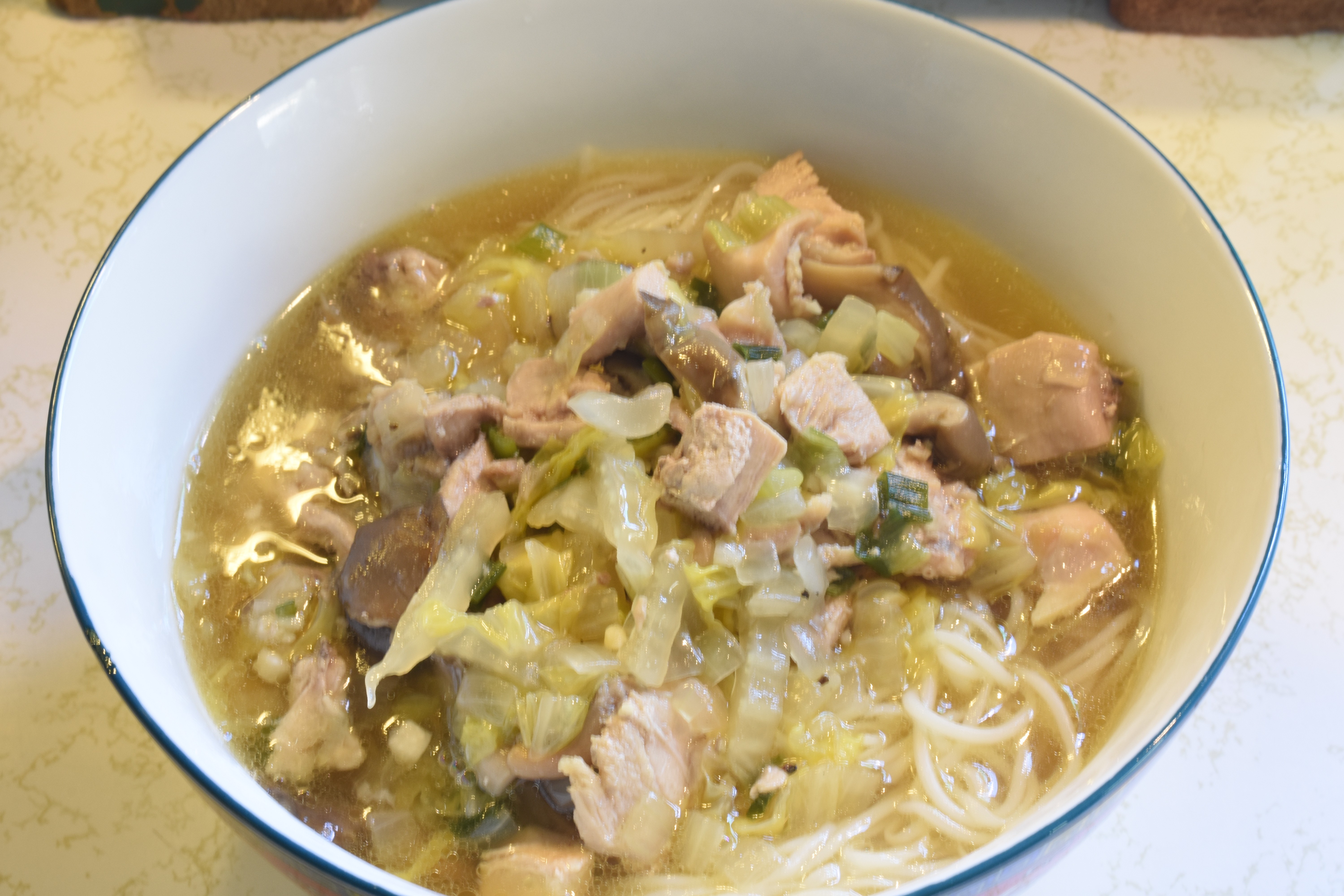 - To serve, plate the noodles into a bowl. Top with the chicken, mushroom and other ingredients.