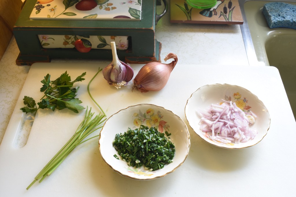 Persillade (pronounced persi-yad, it means parsley) – chop parsley and garlic together, set aside