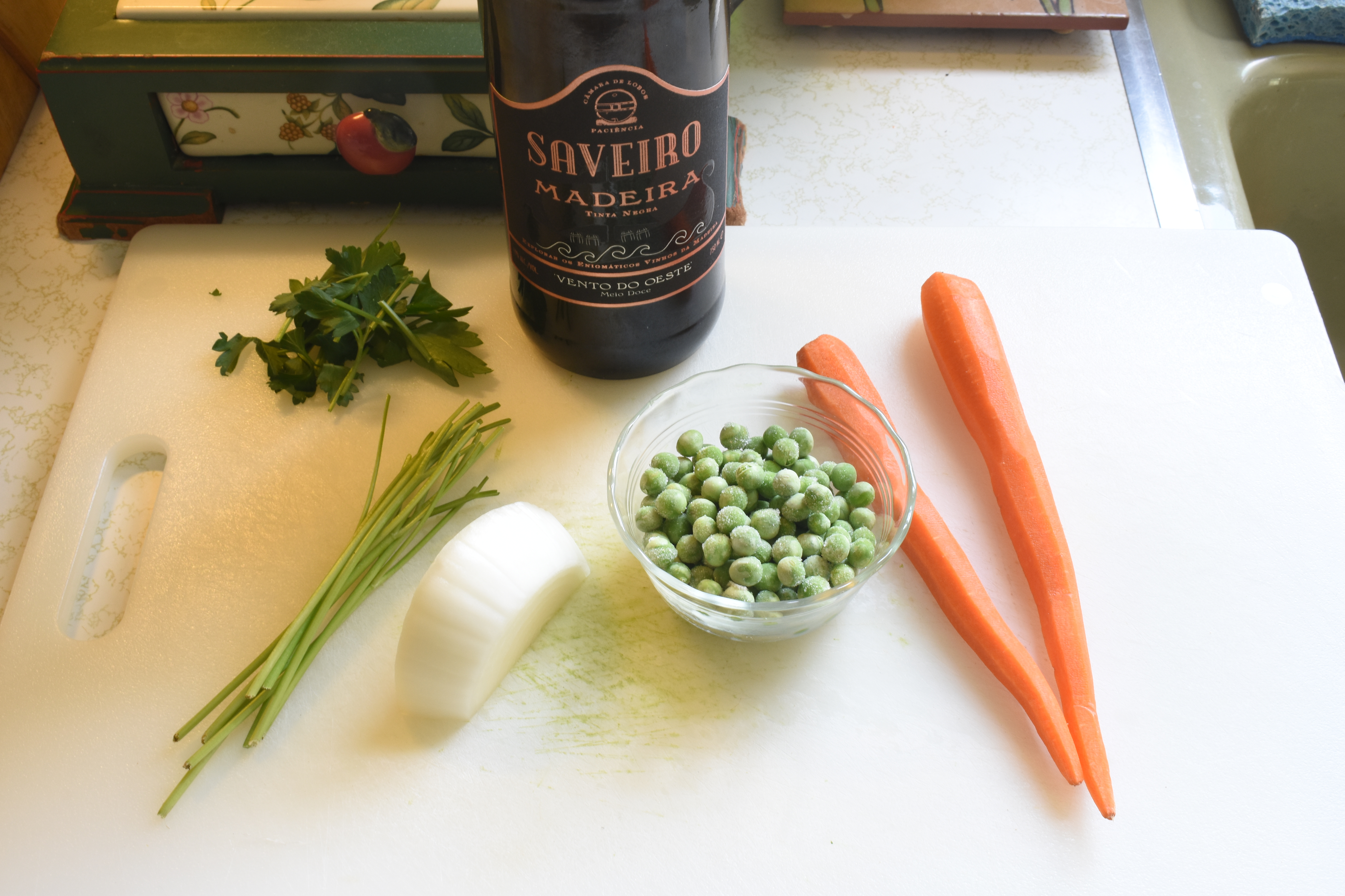 Precook carrots and peas: In a little chicken broth add carrots, parsley stalks and parsley leaves and a little yellow onion. Cook carrots until done turn off heat. Strain and reserve the chicken broth. Remove and separate the carrots and peas from everything else and set them aside. Discard the rest.