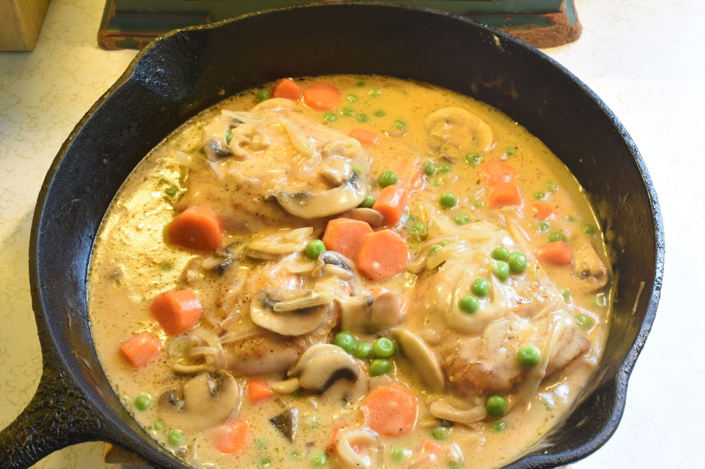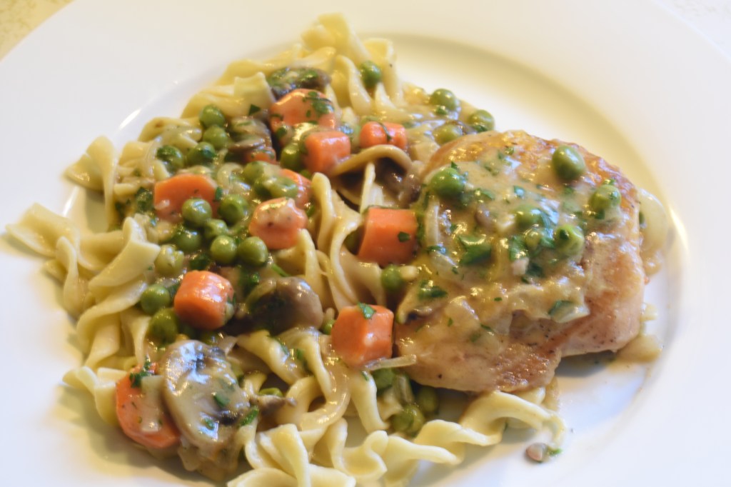 Prepare the sauce: Add butter and olive oil mix. Sauté the onions, shallots and mushrooms. Add the Madeira wine or lemon and zest. Add a pinch of paprika, flour and salt and pepper. Stir. Add the cream and stir. Add the vegetables. Add the chicken stock. Add the chicken and cook in 350° oven 15 minutes. Pull from oven and add the Persillade and mix. Serve over cooked egg noodles.