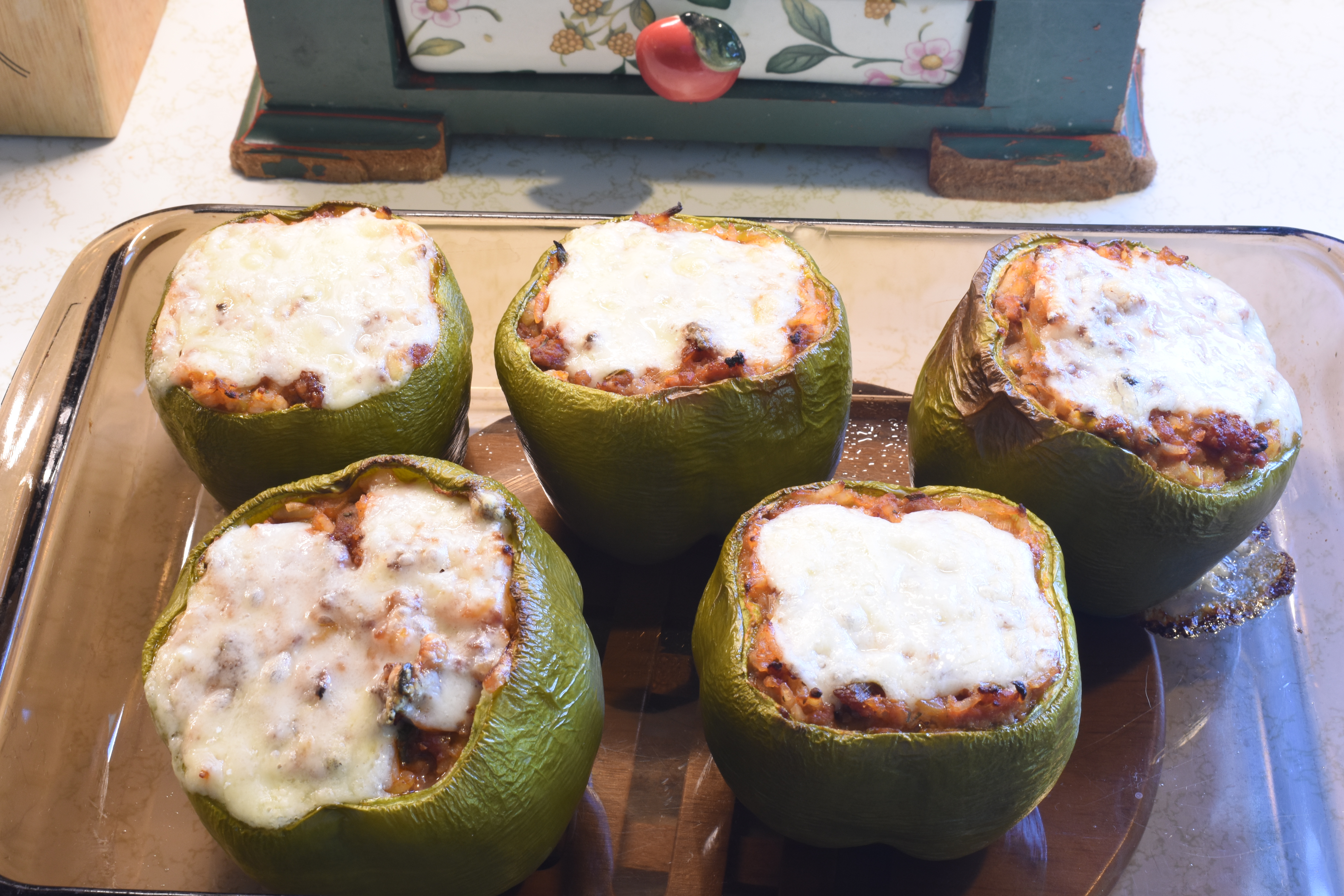 If bell peppers are thick walled, blanch first for 2 minutes after cutting the tops off.