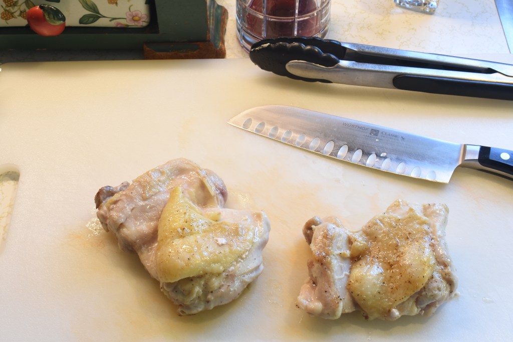 2 deboned chicken thighs (~1 lb.), skin fried cut into 1-inch chunks*