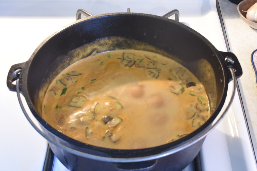 Add the chicken, eggplant, Serrano pepper and scallions. Bring it a nice gentle boil. Reduce about 15 minutes.