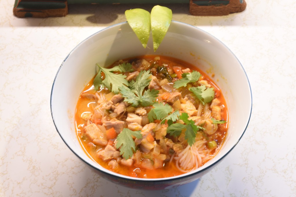 Add the noodles, Thai basil, soy sauce, Shoaxing Wine, fish sauce to the pot. Stir. Cook covered another 5 to 10 minutes on gentle boil. Serve in a bowl with slices of lime and cilantro.