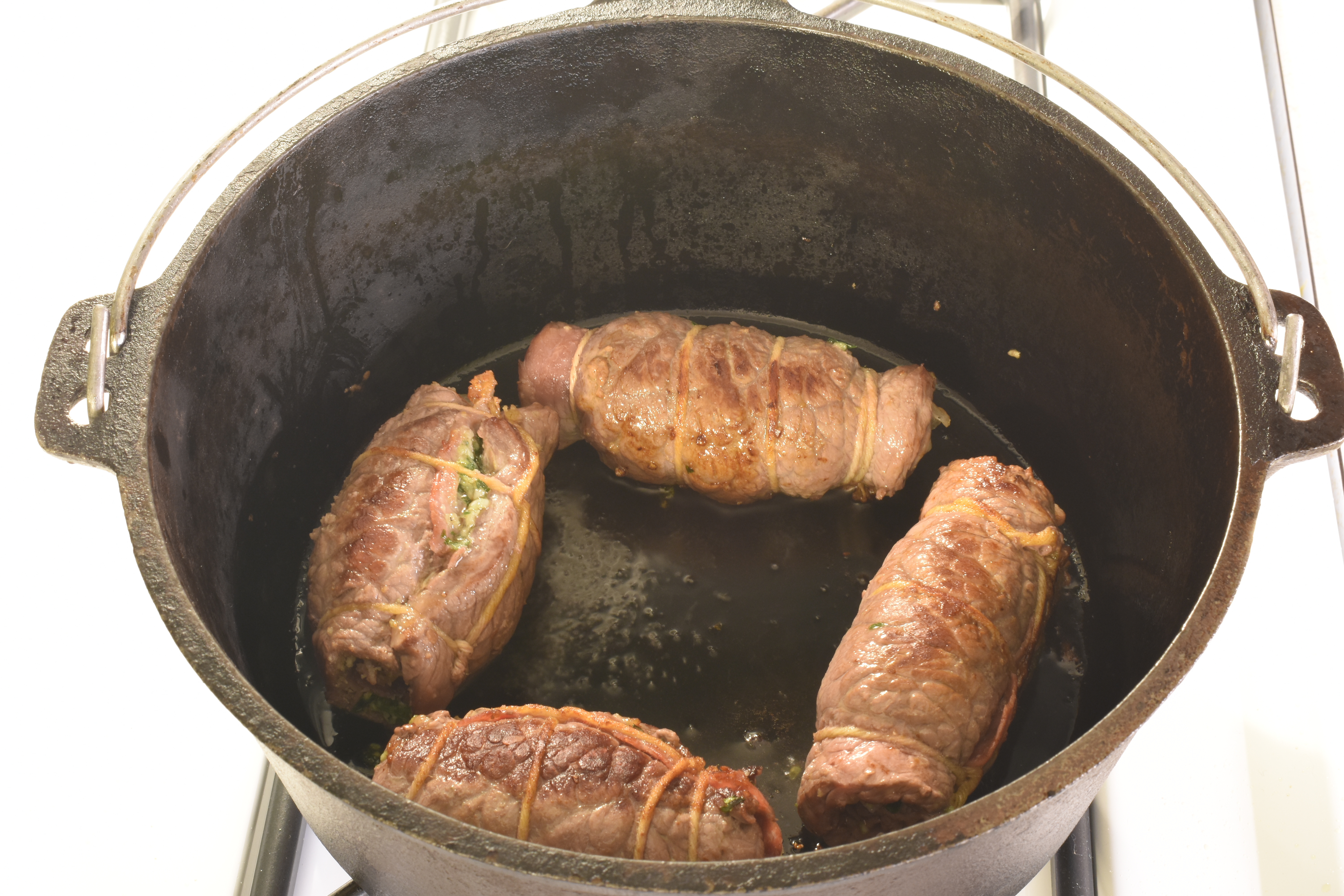 Tenderize the steak slices with the spike textured side of the tenderizer and pound to ~1/4 inch. Add salt and pepper, apply some bred crumbs, Persillade, then Prosciutto, Salame and Provolone. Start with the narrow end and roll the meat. Tie the roll with butcher string. Dry the outer roll with paper towels before browning.