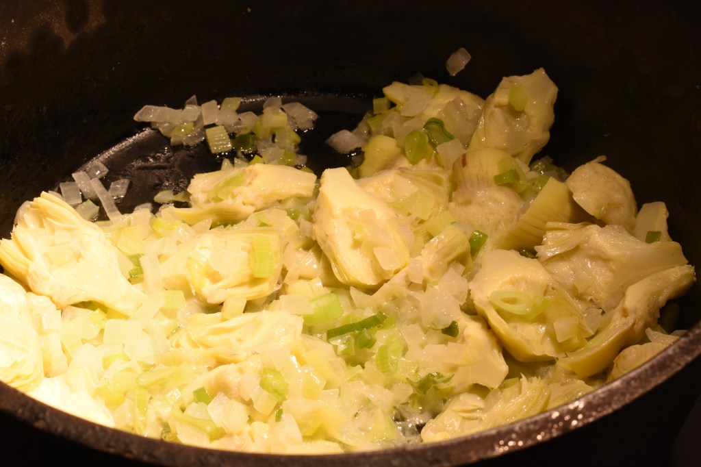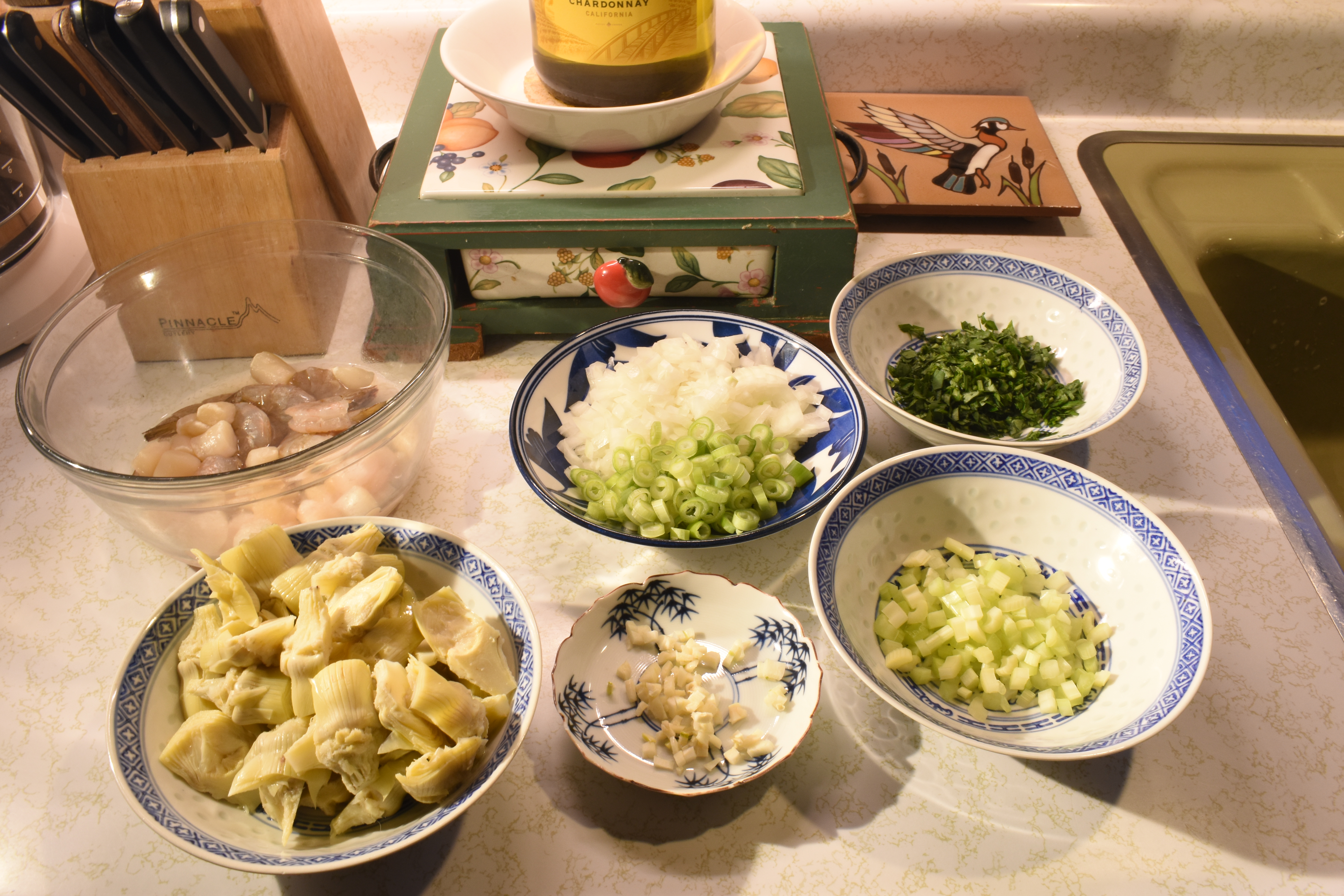 Add the flour and stir well. Add the wine and mix until a white roux appears. Add the clam juice, retained shrimp/scallop and clam juice, and mix to thicken the flour. Salt and pepper. Cook slowly on a simmer heat until the artichokes get a little soft. This soup is cooked low and slow.