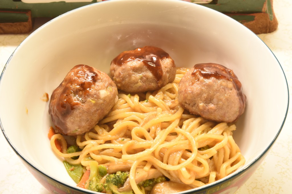 In a wok or fry pan heat the oil and stir fry the veggies, add ginger and garlic, add noodles, add sauce and continue turning over with a wok spoon. Plate the noodle mix and top with the meatballs.