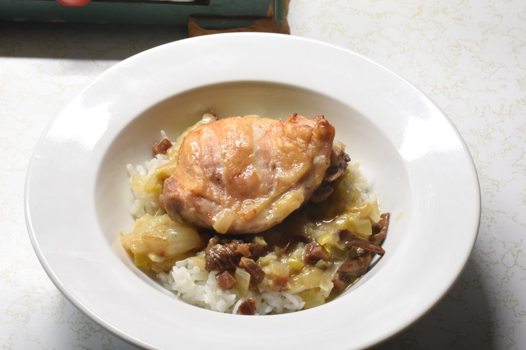 1.5 Lbs. chicken (or 3 chicken thighs, cut two slices across the bone of the thighs)