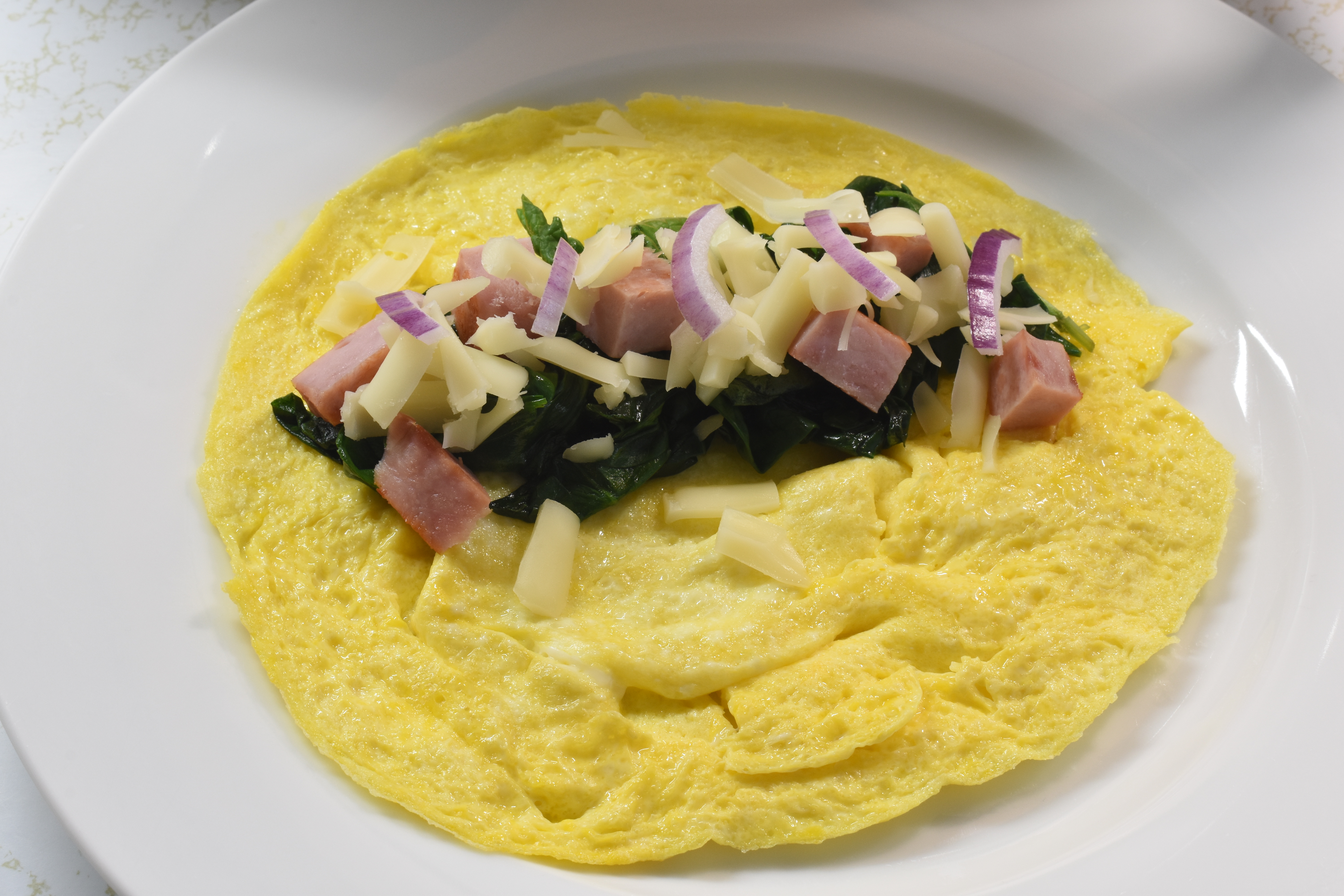 Add the spinach, ham, red onion and cheese to the center. Fold over one edge. Place the omelet into a microwave and cook high for 20 seconds so the cheese melts without over cooking the egg. The egg should be soft and moist.