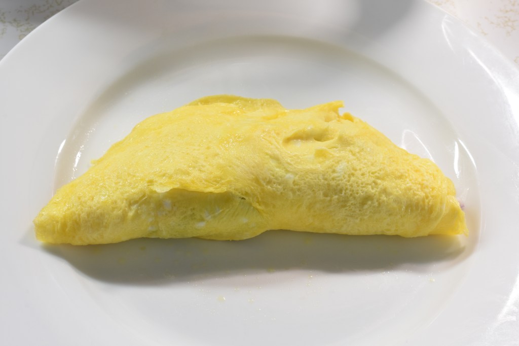 In a small 8” non-stick fry pan, melt the butter on medium heat. Pour in the eggs and as the eggs begin to cook push back the edges so the center wet eggs are able to get to the hot edge of the pan. When the eggs start to harden without the bottom browning, flip the egg and cook the other side briefly. Pour the eggs omelet onto a plate.
