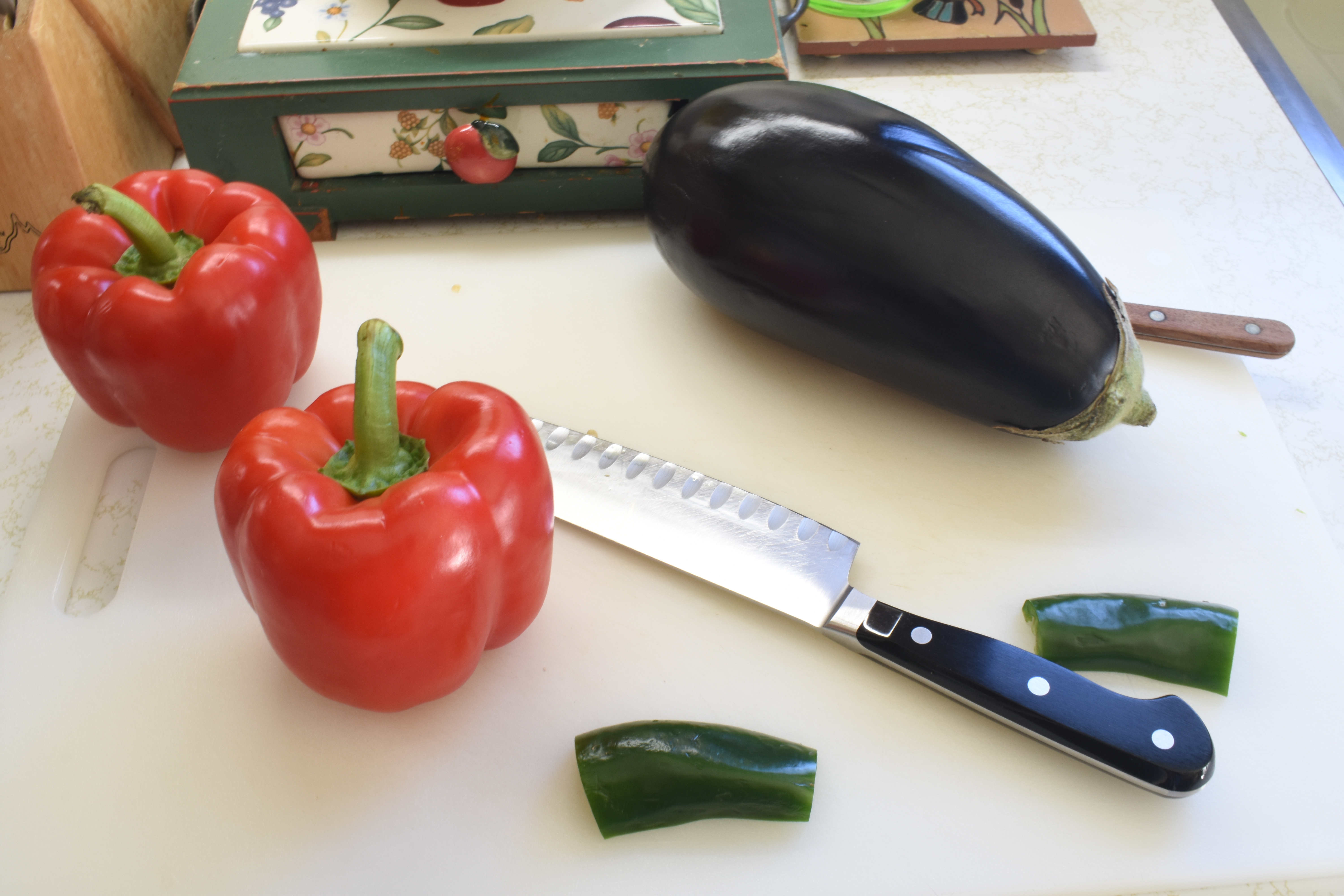 Choose a male eggplant. Look for a round navel. The long thin navels are female and have too many seeds. Poke holes in the eggplant skin. Cut the eggplant in half long ways and place cut side down on a cookie sheet. Roast in a 450° oven 35 minutes. Scrape the eggplant meat into a large bowl and discard the skin. Add minced garlic and salt and with a potato masher mash the meat. Then add 1 TBSP lemon juice, 1 TBSP Tahini sauce, a dash of cayenne pepper and 1 TBSP olive oil. Taste and add more of what you think it needs. Take a whisk and whisk all together. Place in a covered container and refrigerate a couple of hours. The flavors need to meld.