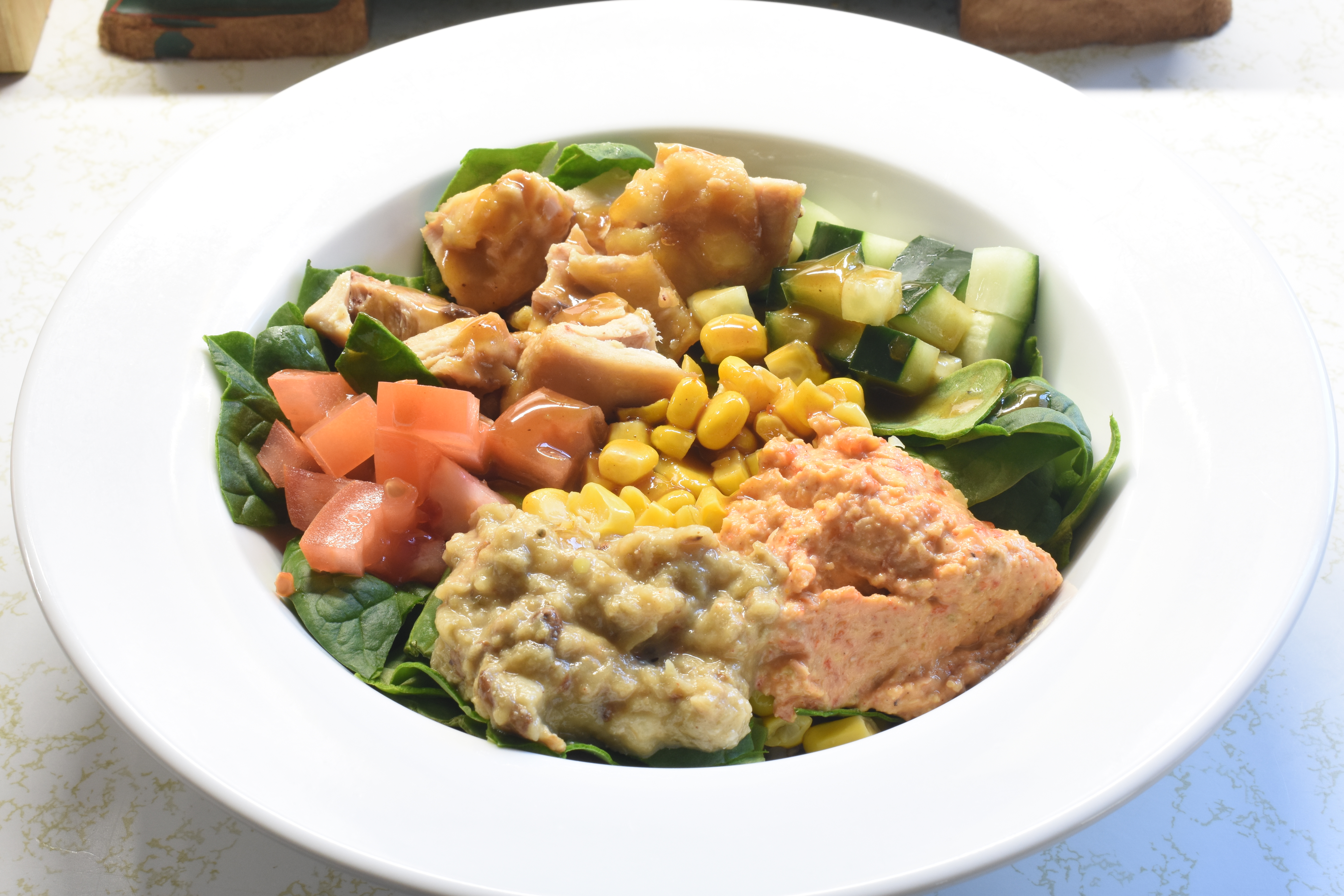 Add the brown rice, veggies, chicken, a spoon full of hummus and a spoon full of Baba Ganoush. Pour Vinaigrette onto the salad one TBSP at a time.
