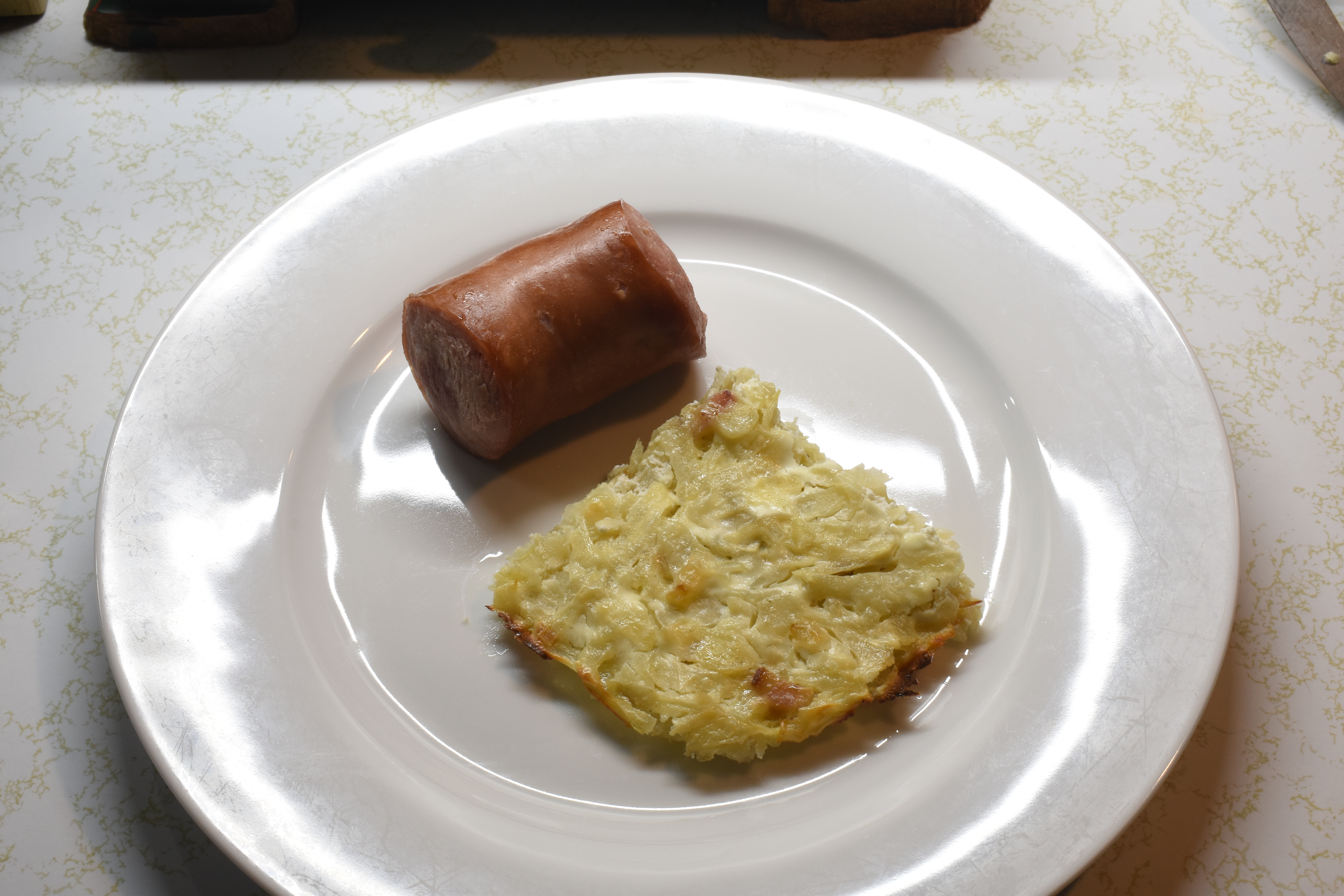2 medium potatoes skinned and grated. Soak the grated potatoes in water and wash – twice. Drain and dry. In a non-stick fry pan place the potatoes in, place on medium-low heat and dry for several minutes. Remove and set aside.