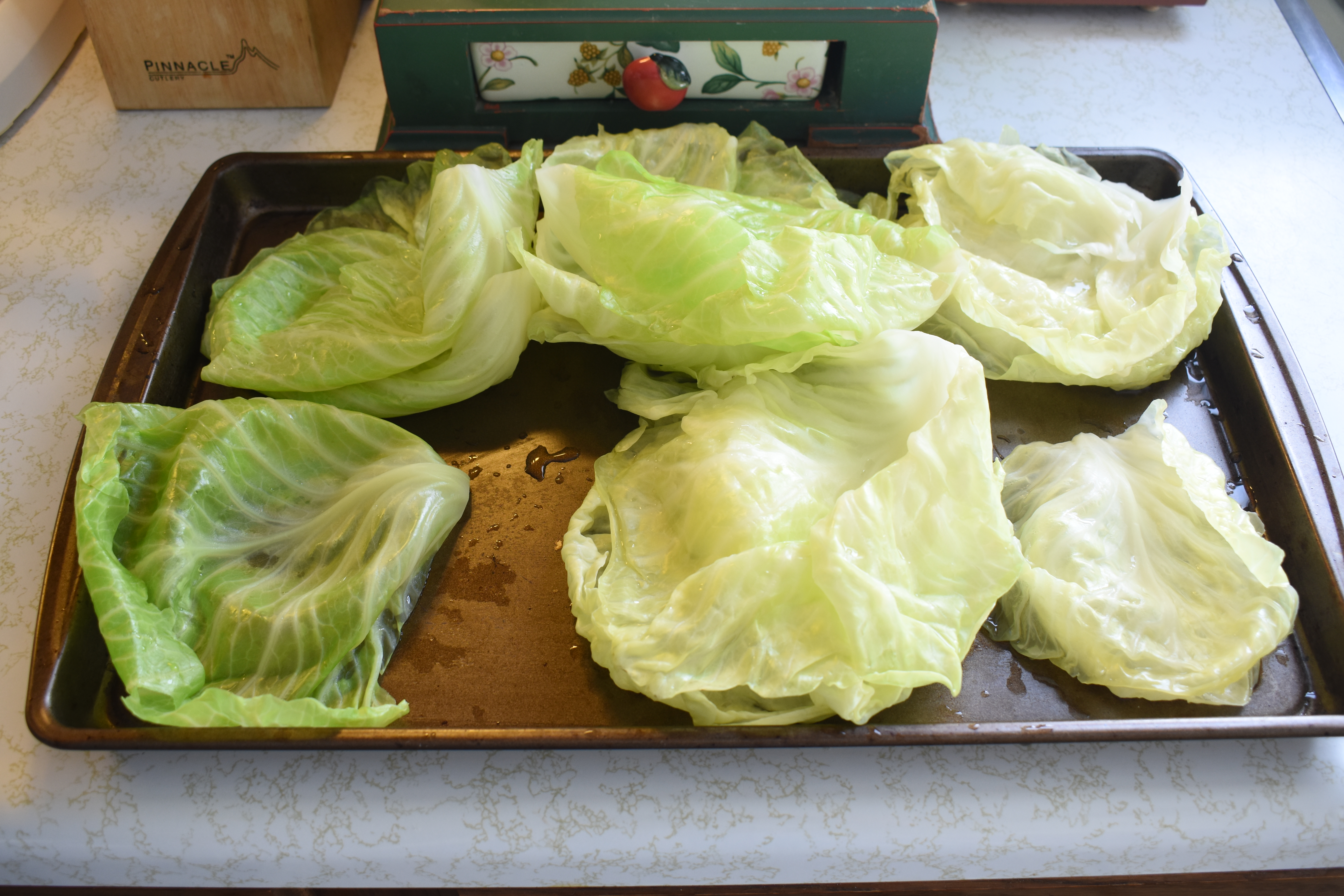 Cabbage – Cut the core out of the center of the cabbage. Place in at least a 7 Qt. pot half full of boiling water with the core side up. Boil a couple of minutes and then gently remove the leaves with tongs and place on a tray, keep doing this until you have peeled all the biggest usable leaves and that the leaves are cooked but firm enough to roll. Set aside to cool. With a knife shave the top main part of the rib off of the cabbage leaf to make the leaf flexible.