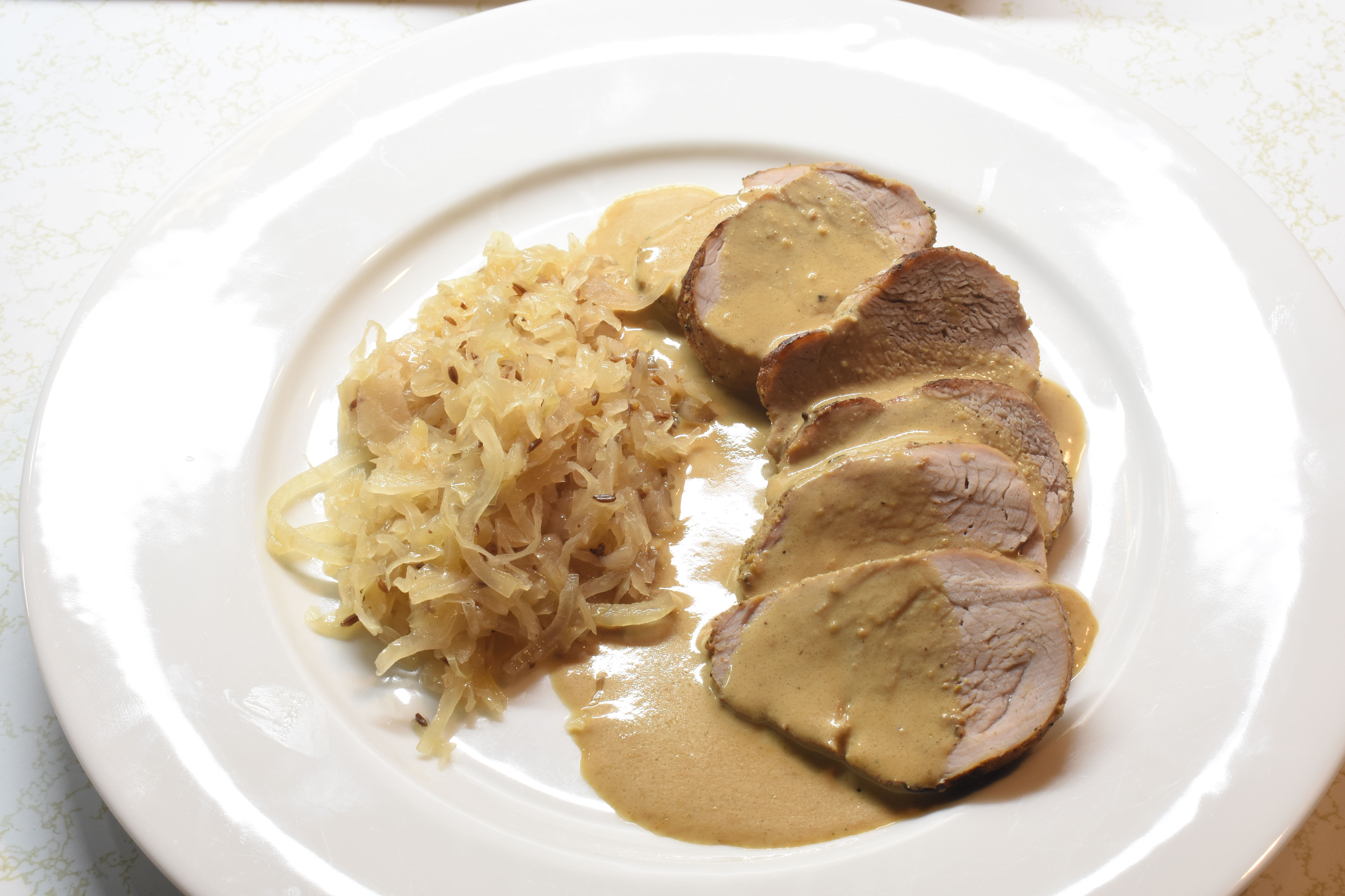 In the pan used to sear the pork, heat on medium heat and add the Creamy Mustard Sauce. Add the mustard sauce to the pan juice and mix until thicker.