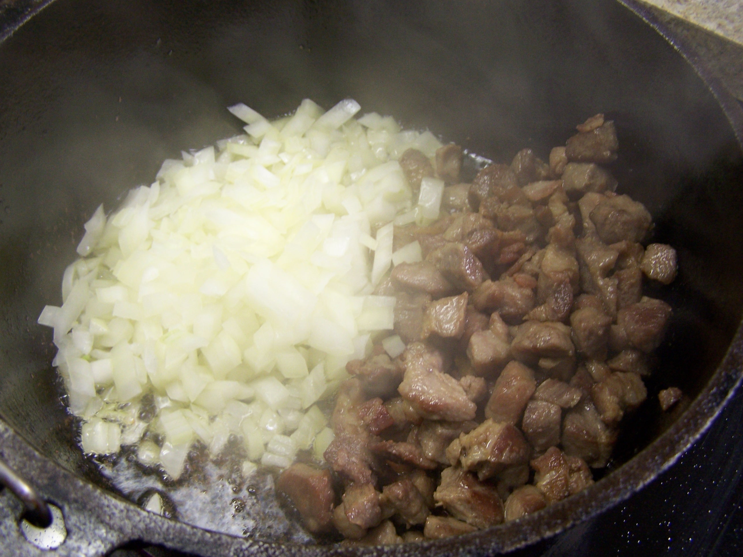When the pork is browned add the bacon. Move the meat to one side of the pan and then add one handful of chopped onions and sauté.