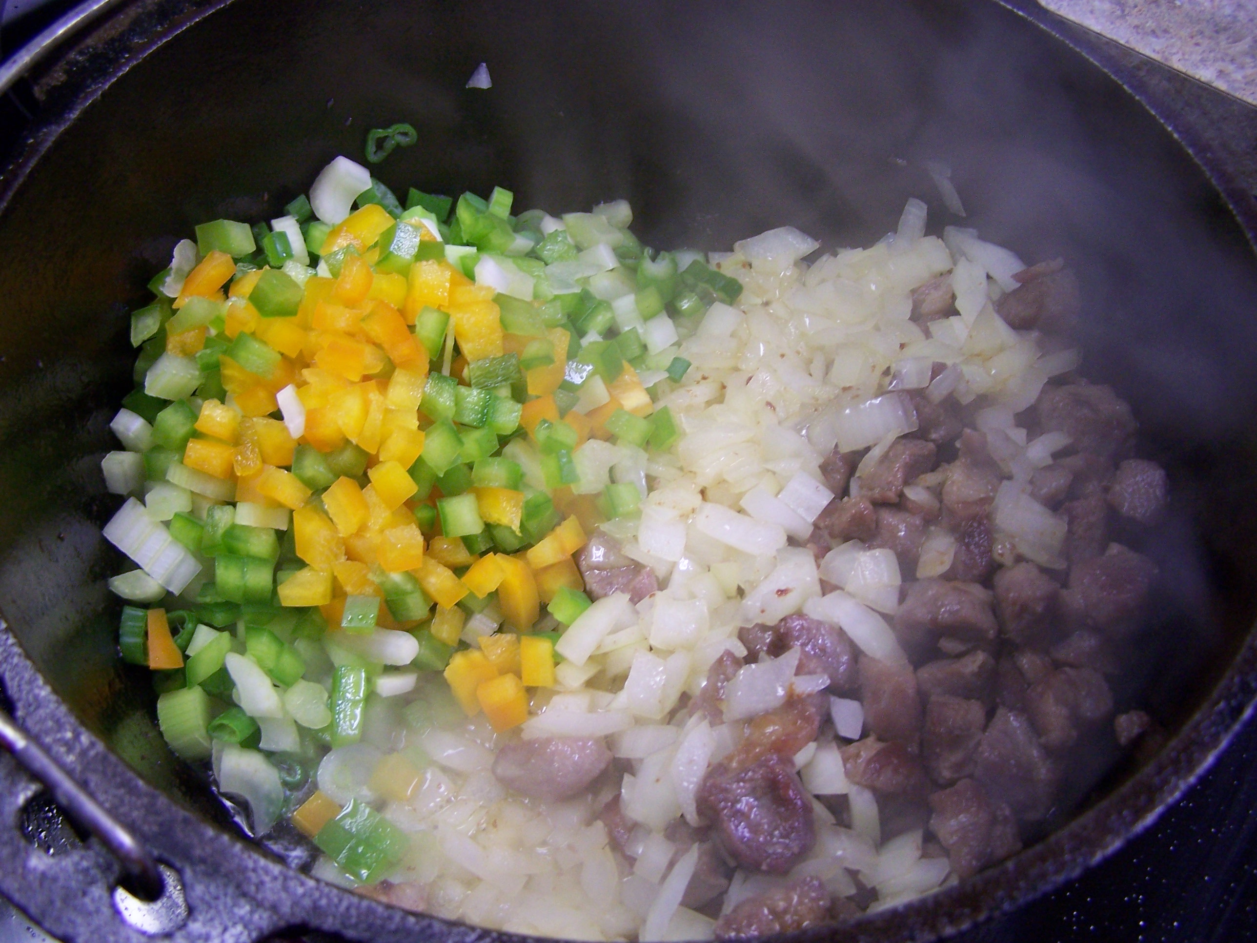 The next decision is the vegetables. In this one I will use onions, green onions (scallions), green bell pepper, orange bell pepper, garlic and celery. To me, orange bell pepper is sweeter than red.