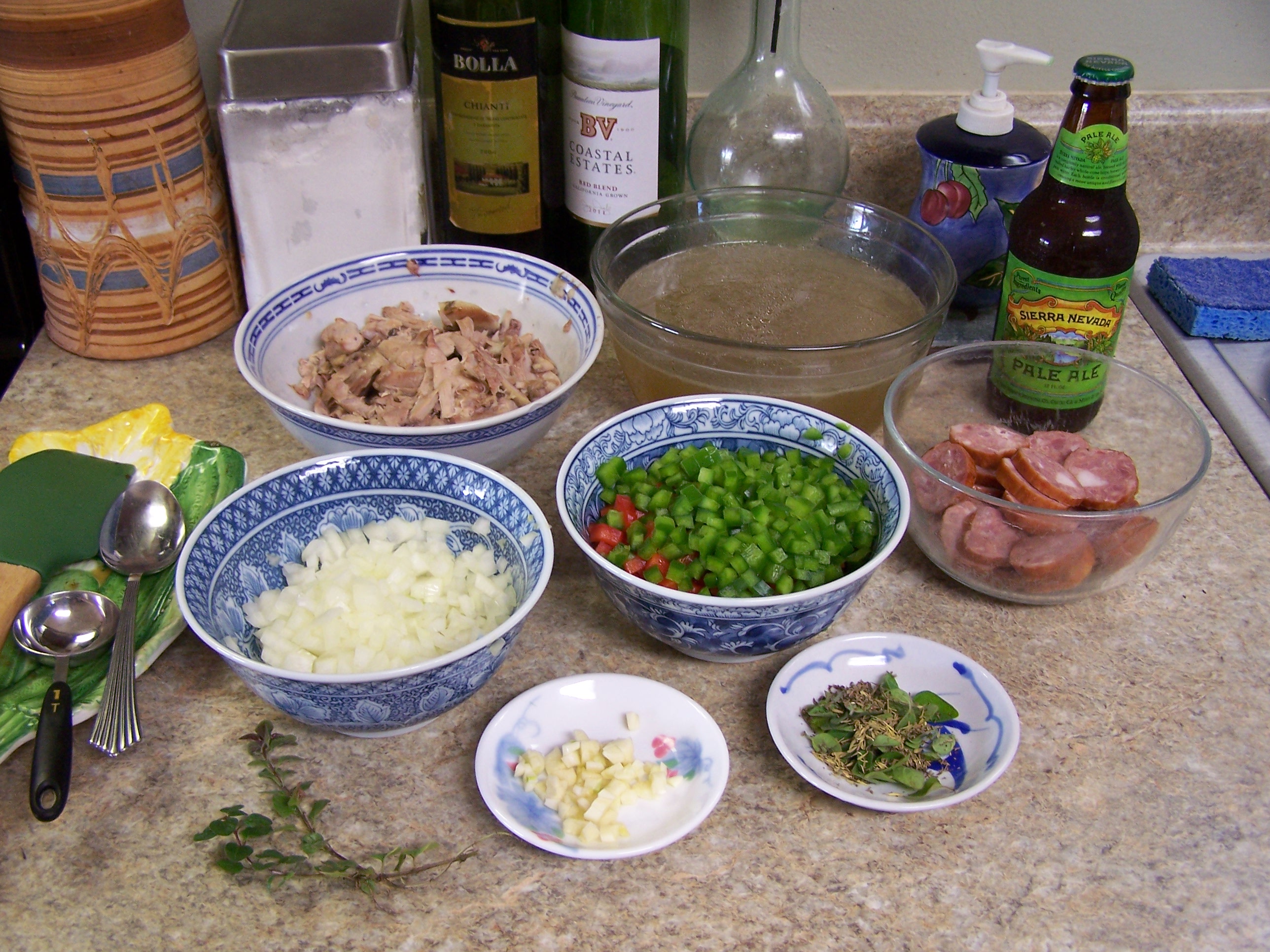 There are two flavors of Jambalaya. One is with tomatoes, the other is without tomatoes. I make the one without tomatoes. Why? Pretty simple, really. Those people in New Orleans like to dump everything into a pot, add tomatoes, hot peppers, broth, grab a beer and call it a day. People like me who live near New Orleans in the rural regions, drink wine with our pinky-finger extended and cook this dish in stages because it is better that way. We brown the meat and cook the veggies gently. We don’t need hot peppers and tomatoes. Because, that’s the way we roll.