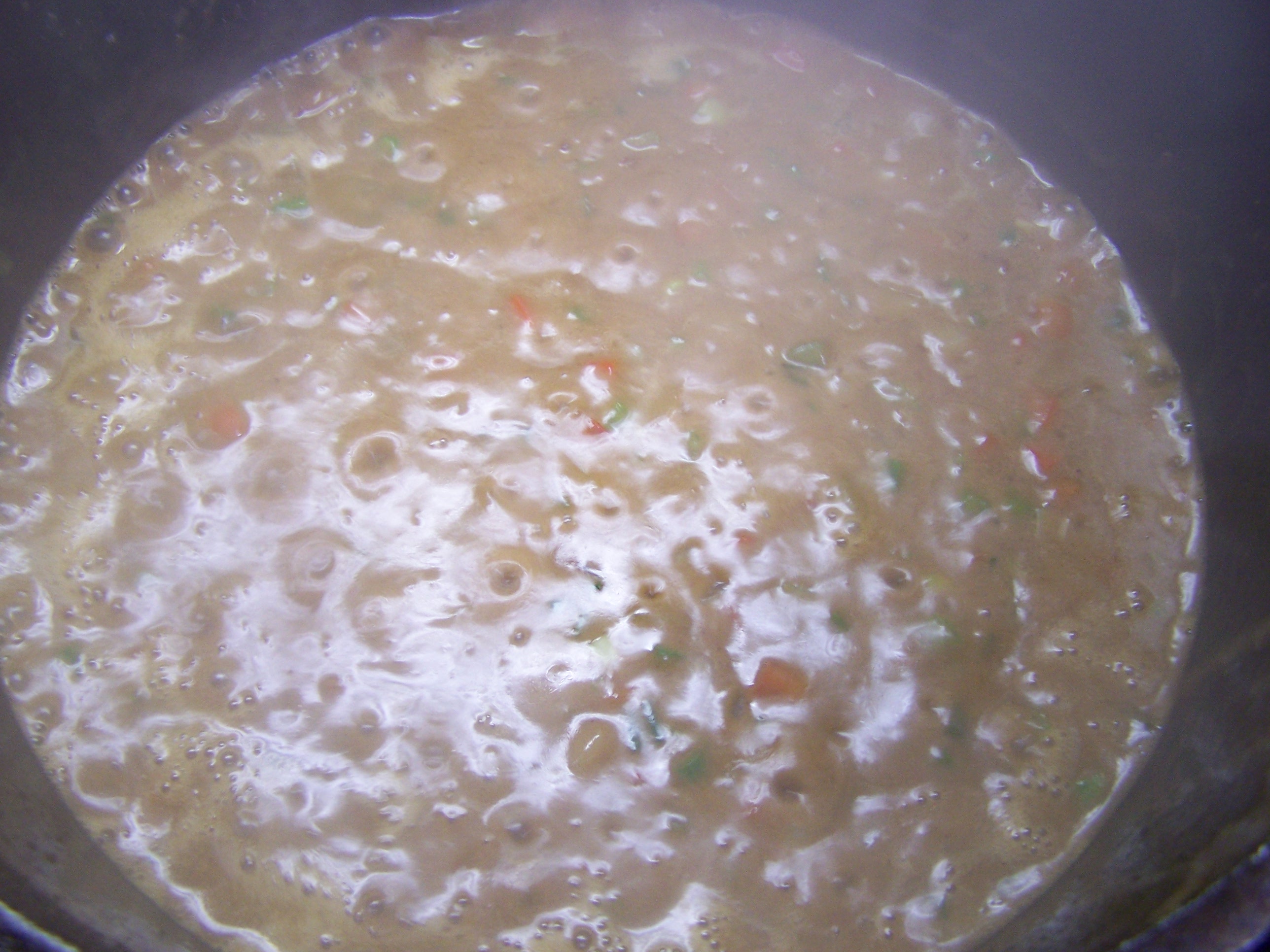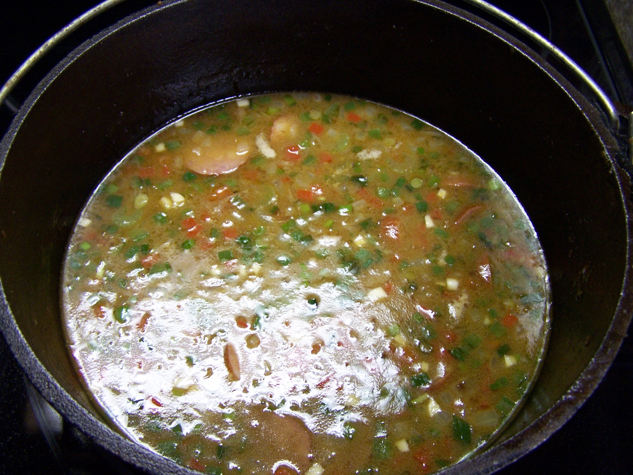 Add the rest of the stock and the rest of the ingredients. Stir. Bring to a slight boil. Reduce heat to simmer. Cover. Cook 45 to 60 minutes. Let rest and serve. Apply Tabasco on top of serving.