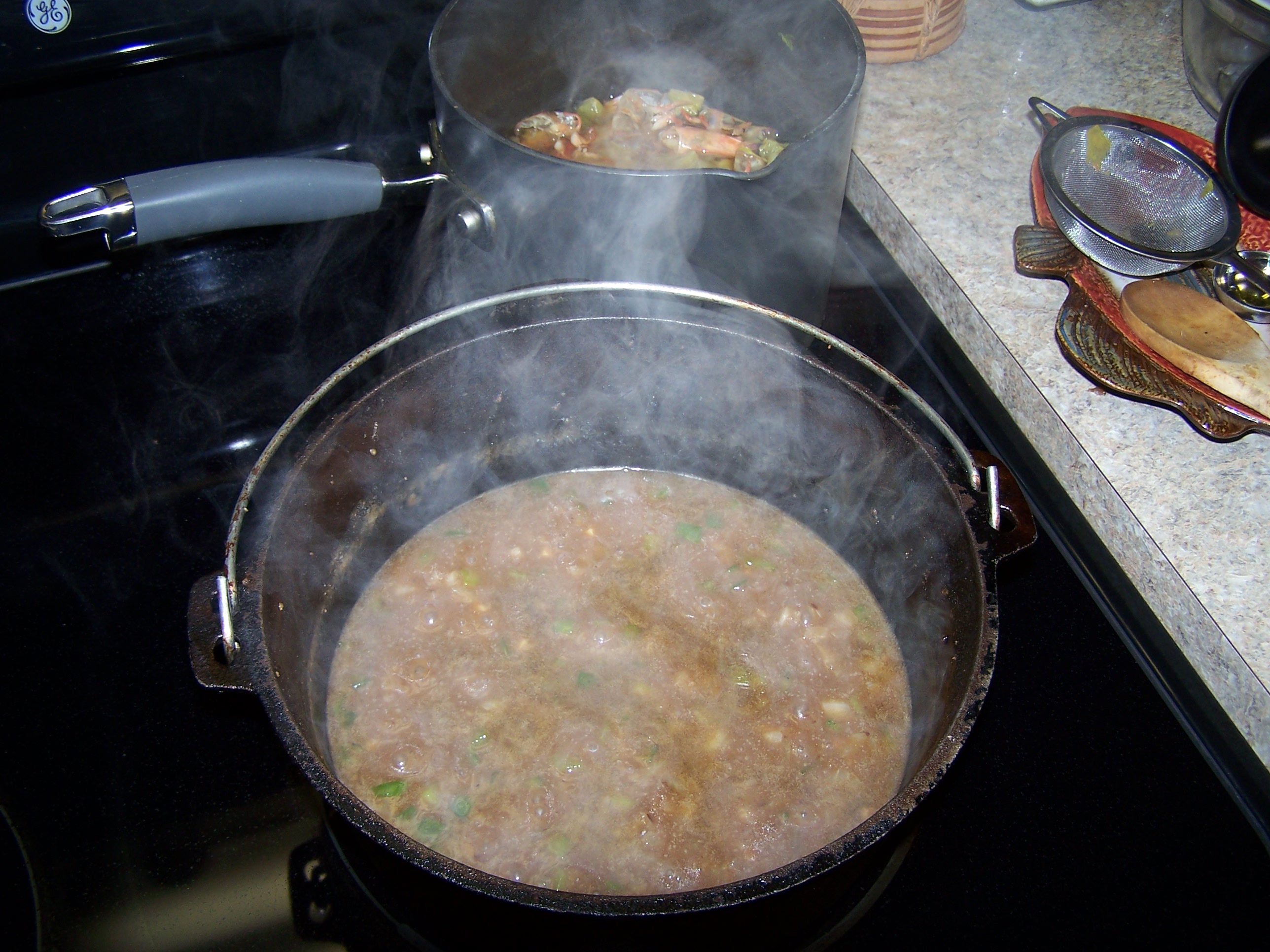 After boiling the roux sauce for 30 minutes add all remaining ingredients and then ladle-in a little more shrimp stock if necessary until all the ingredients are covered with stock. Some of the stock will evaporate when first cooking the roux. You have to feel-the-feel on that. Place lid over pot and simmer another 30 minutes.