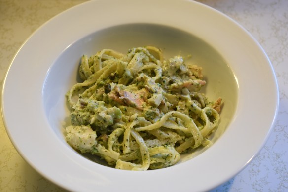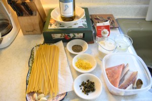 Knead the dough. Cut into six quarters, run through a pasta machine on setting 2, then 4, then setting 6. This will yield 6 pasta pieces. Cut the pieces in half. Boil in water 1 minute. Remove and set aside. You might not need all this pasta but it better to cook more so you are not short. Boil pasta then remove and place in a large bowl of cold water until ready to use.