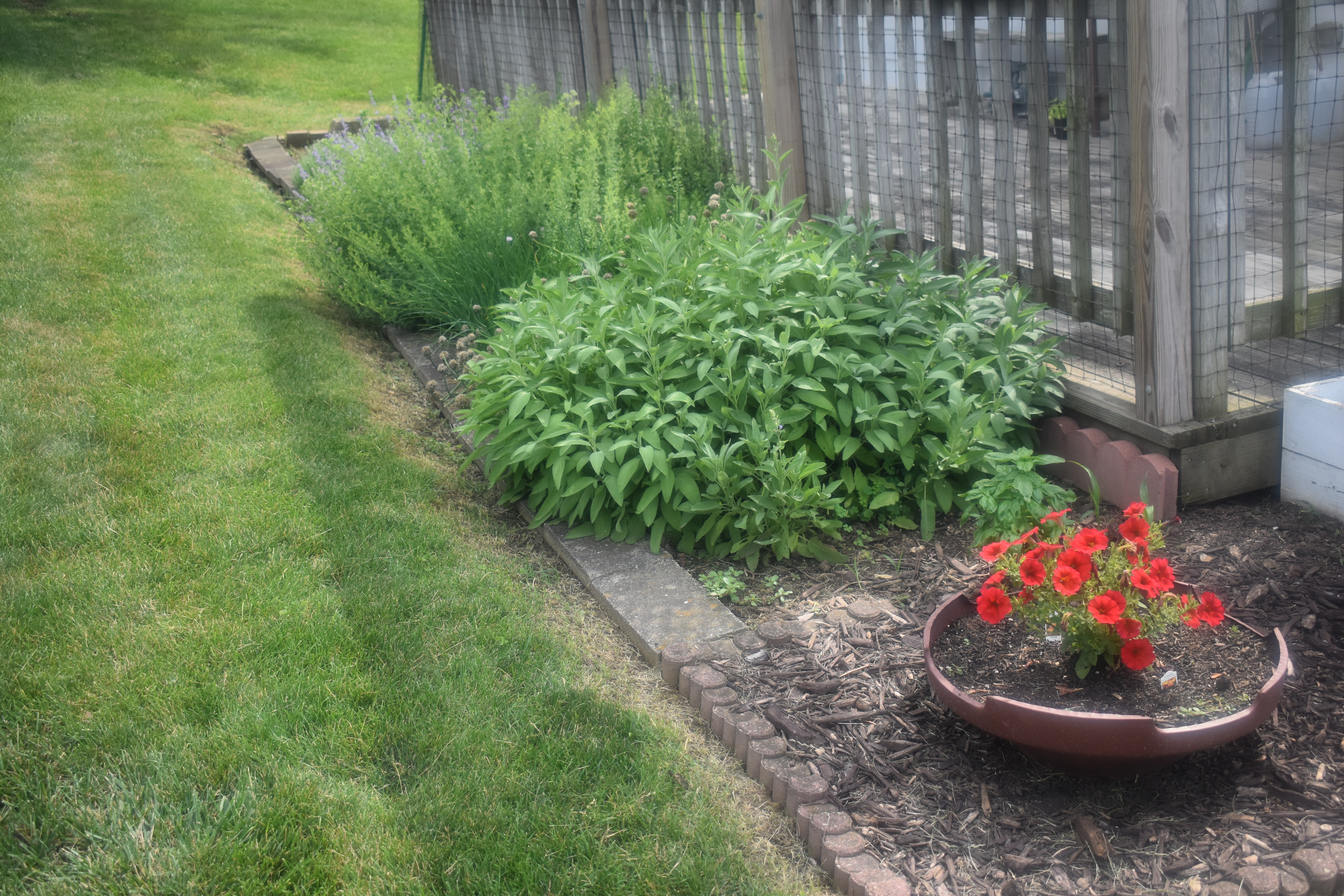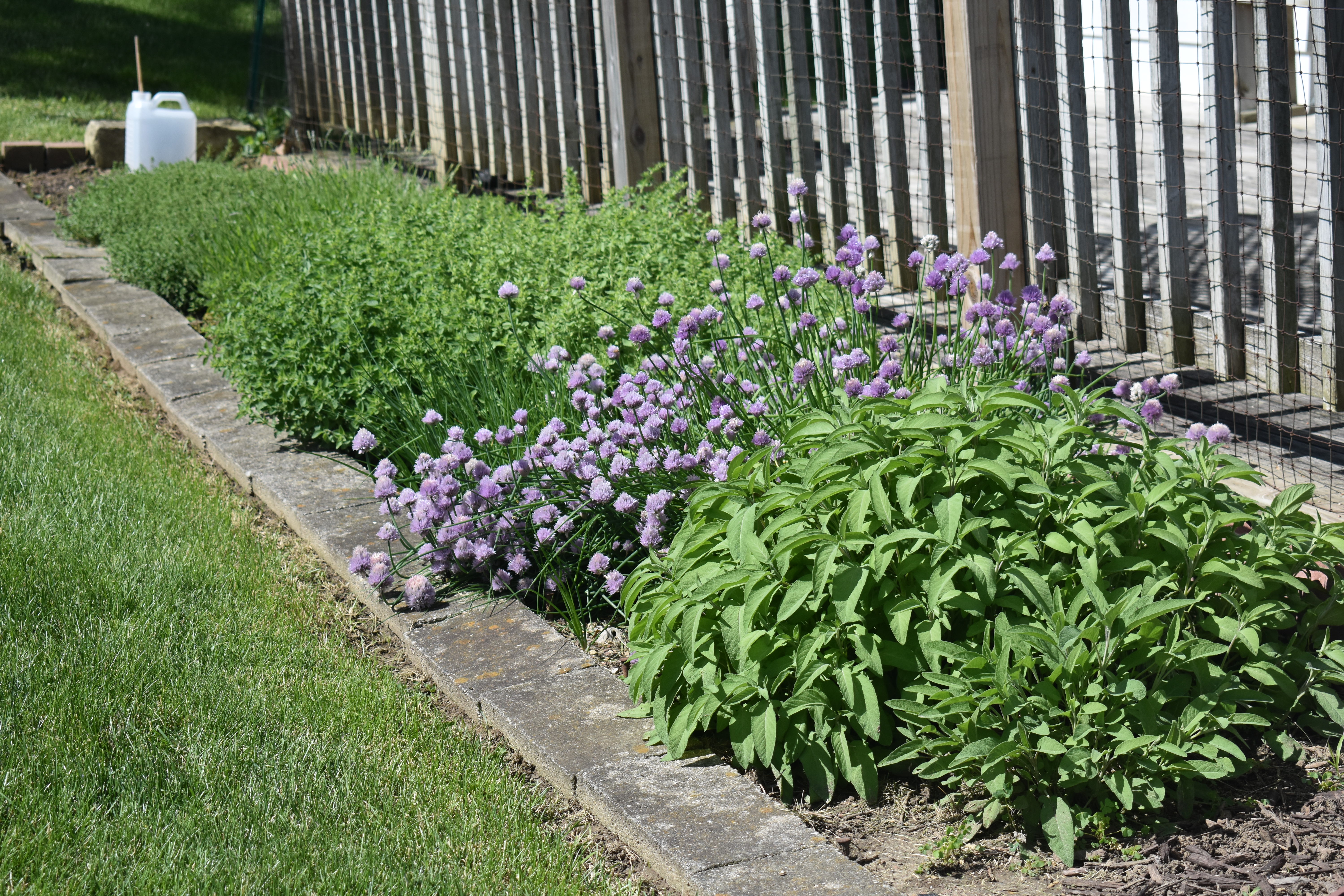 Herbs 5/29/24 (front to back, sage, chives, lavender, oregano, thyme and rosemary) The jug in the back is Italian Basil and Thai basil planted in front of the sage)