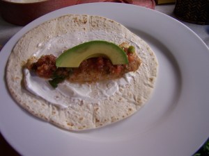 On a warn tortilla, apply sour cream, fish, salsa, avocado, cilantro and squeeze lime on top and roll in a burrito.